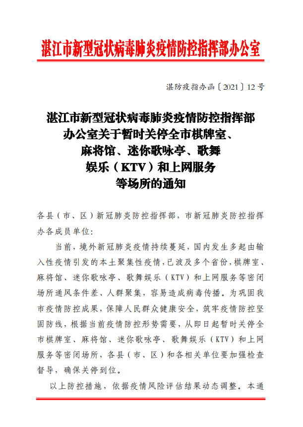 关于暂时关停全市棋牌室、 麻将馆、迷你歌咏亭、歌舞 娱乐(KTV)和上网服务 等场所通知
