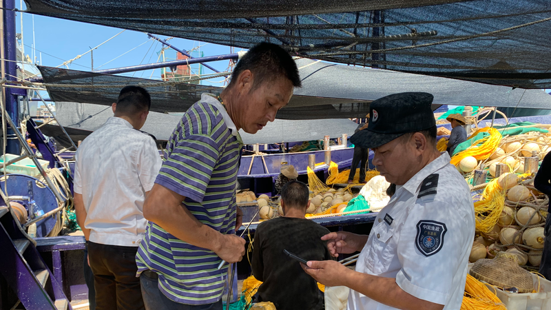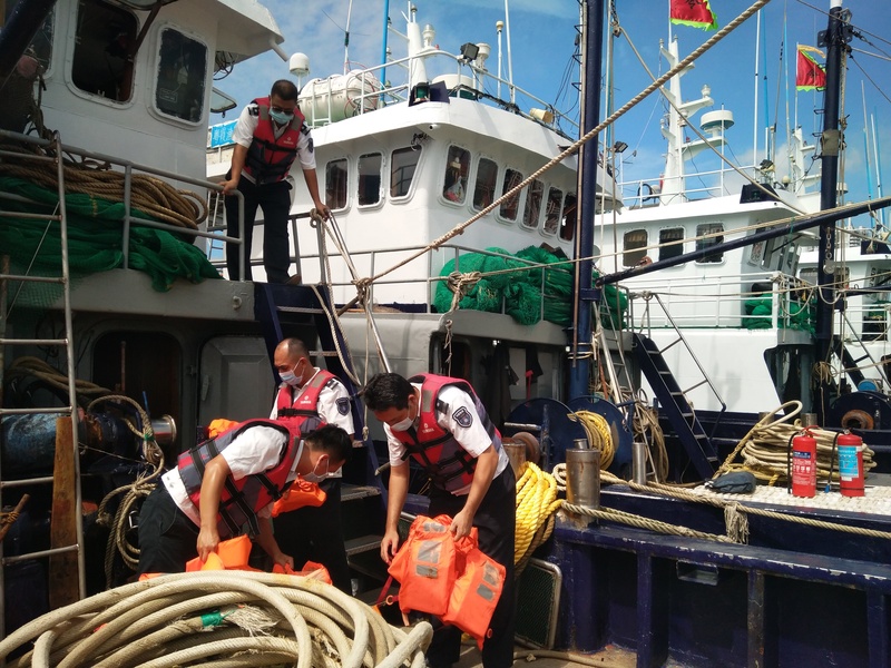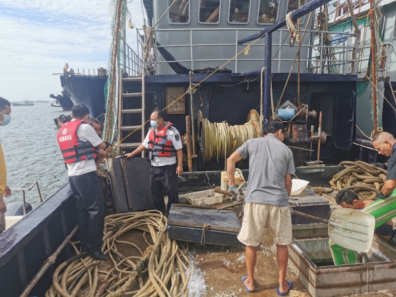 8月16日上午,为了把好南海伏季休渔最后一关,保证渔船在开捕后有序、安全生产,湛江霞山渔政大队到湛江港渔业港区开展安全检查暨疫情防控宣传工作,为湛江2021年开渔做足准备。