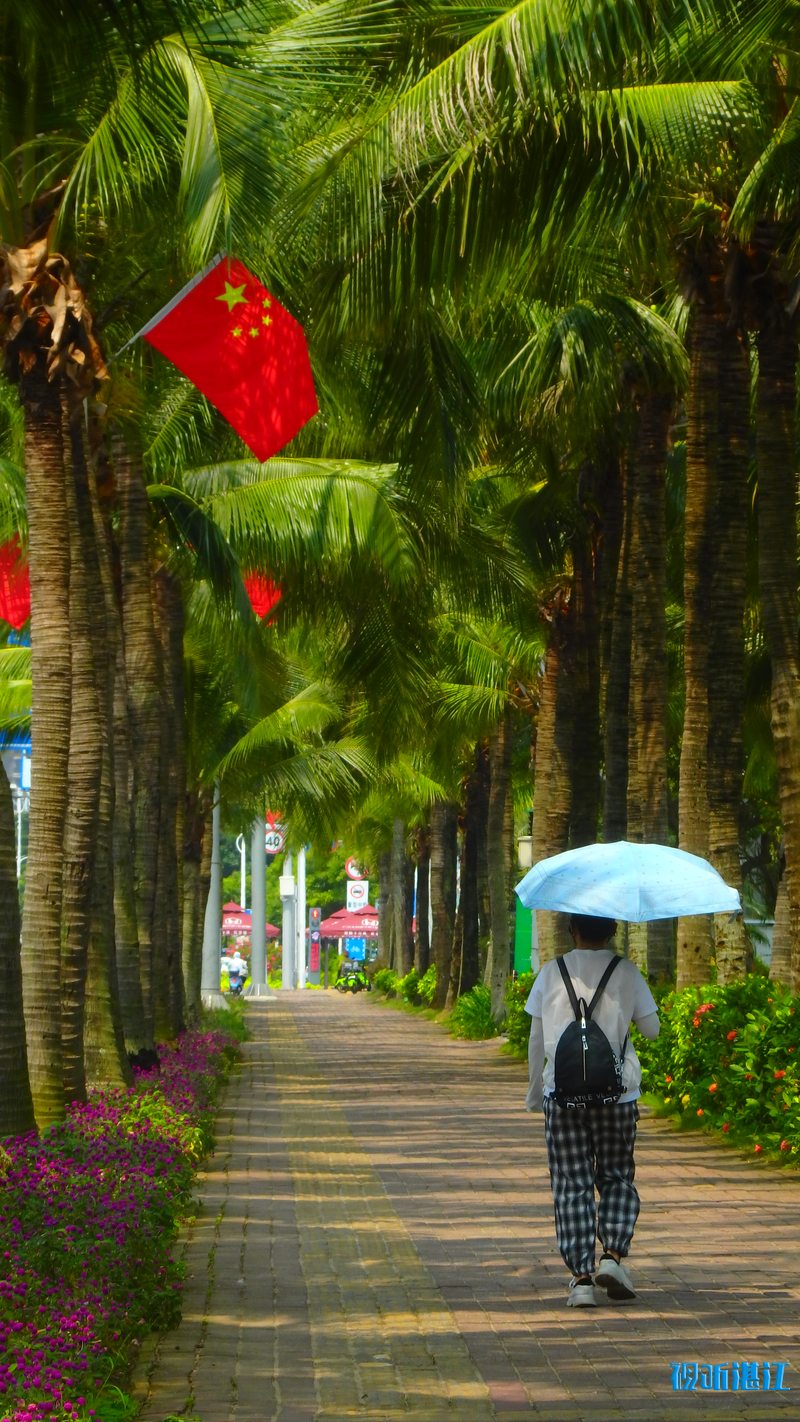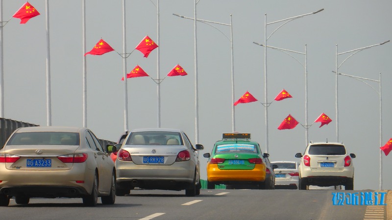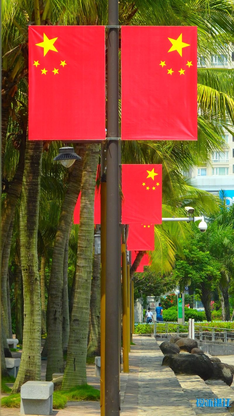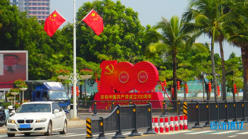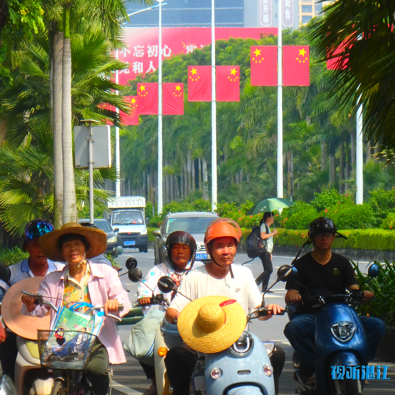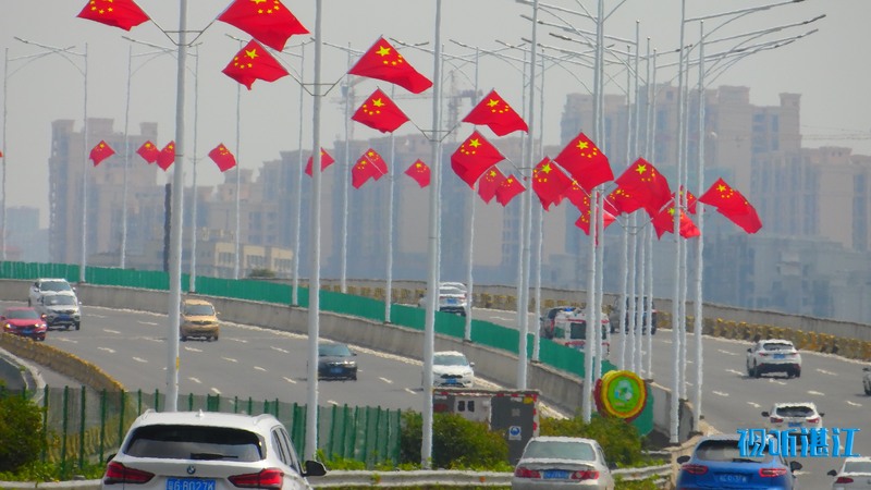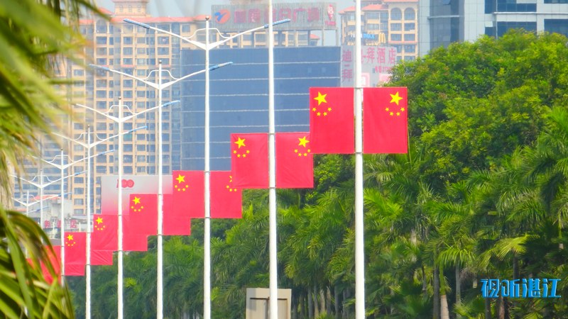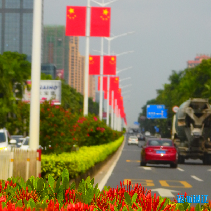 在4A景区金沙湾滨海休闲旅游区毗邻的观海北路和广州湾大道,遍地新种的绿植青翠欲滴,衬托出国旗无比鲜艳;在椰树掩映中,悠闲自得的行人行走在国旗下;在海田路与海北路交叉路口,鲜红的国旗与庆祝中国共产党成立100周年的巨幅标语互相辉映;在西城快线,滚滚车流朝向国旗的方向;在人民大道,一面面国旗串成昂首向上的长龙。鲜艳的中国红,渲染出满城的喜庆。