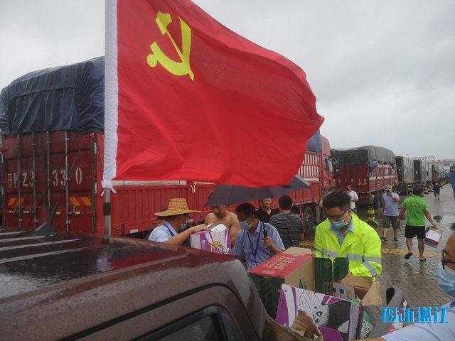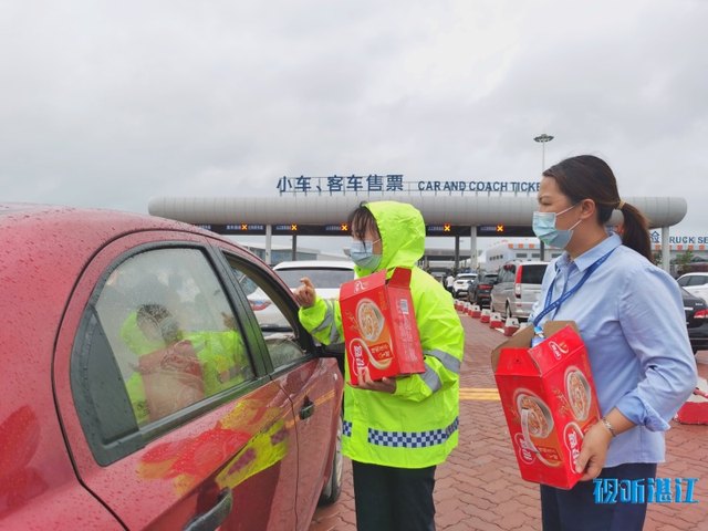 9日一大早,徐闻港党员干部职工冒着风雨,穿梭在港区货车、小车之间,为司机、旅客们免费派发方便面、八宝粥、矿泉水、面包等爱心物资,送去慰问和关怀,让爱和温暖在徐闻港传递。连续三天来,徐闻港累计为滞留在港口的司机、旅客免费派发八宝粥2200瓶、快餐面1600盒、面包800个、矿泉水2800瓶。