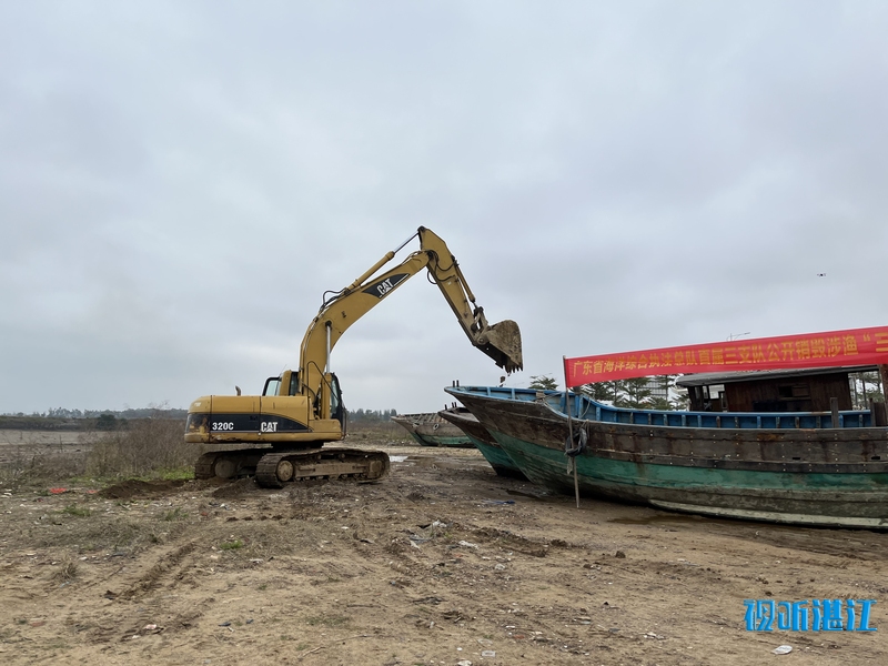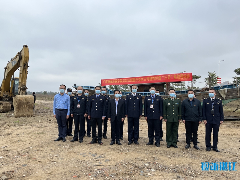 1月25日,省海洋综合执法总队直属三支队在湛江奥体中心游泳馆对面三柏西避风塘举办公开销毁涉渔“三无”船舶现场会,集中销毁2021年7月以来查获没收的4艘中型涉渔“三无”船舶。