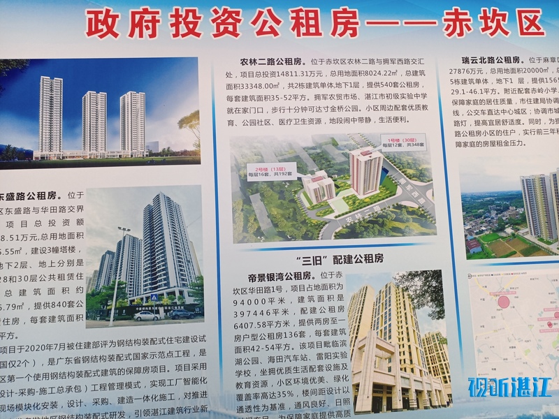 赤坎区东盛路南侧公共租赁住房项目可提供公共租赁住房840套,项目采用了绿色钢结构装配式, 满足国家建筑A级标准、国家绿色建筑标准。小区内设有智能门禁卡和全天候视频监控,并配备了专 业的物业管理队伍,使贫困户家庭受保障群体从“有得住”向“住得好”迈进一个新台阶。