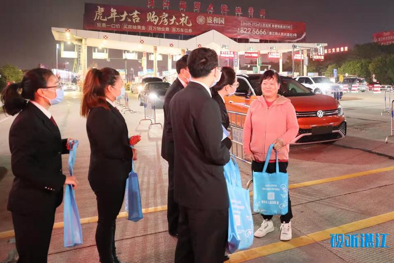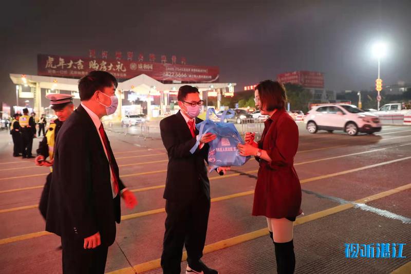 在海湾大桥下桥出口处,坡头交警设卡对过路车辆的驾驶员是否存在酒驾、醉驾等违法行为进行检查。坡头区人民法院的干警也手持“暖心包”,向驾驶员进行普法宣传。