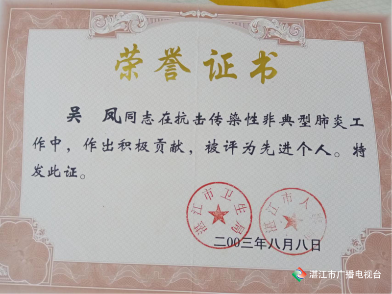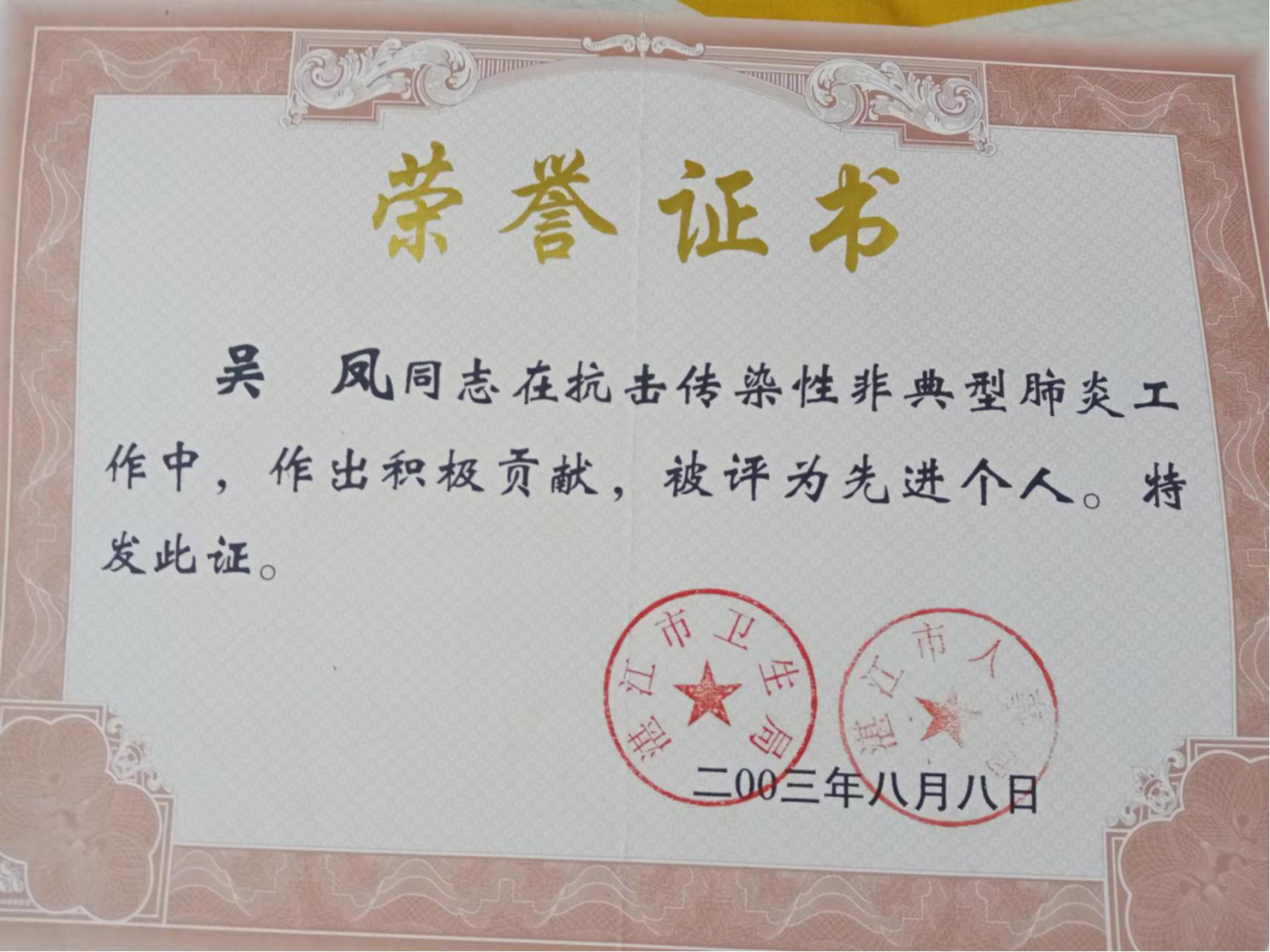 1996年到广东医附院工作至今,吴凤已是一名经验丰富、身经百战的护理人员。她曾参加过2003年抗击非典工作,当时在感染内科主要承担非典确诊患者的特护工作,因工作突出荣获“湛江市抗击非典先进个人”荣誉称号。