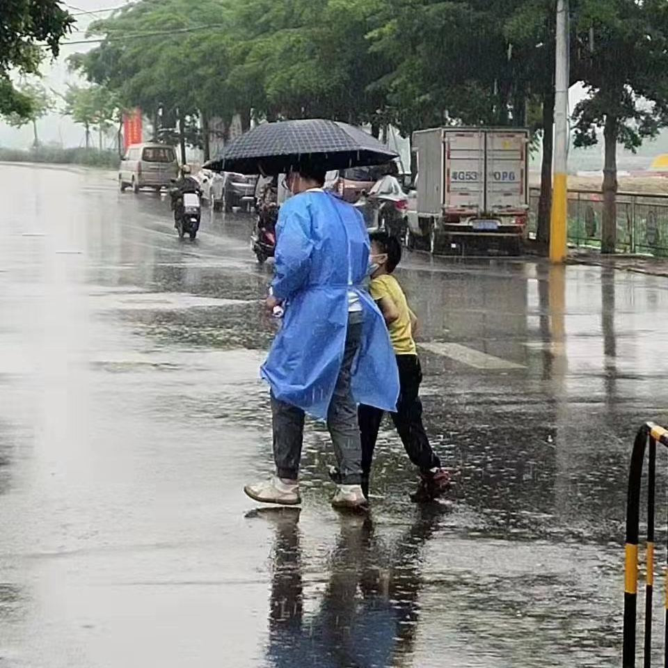 15日下午,雨一直沥沥下个不停。在圩口油行卡哨点过往的车辆和人员逐渐稀少。因简易帐篷难以抵挡雨势,几个值守人员便跑到傍边的商铺门口暂避。这时队员陈炳杰发现身边一名小男孩不停地跺脚或走来走看很焦急痛苦的样子。“小朋友,你有急事吗?家里大人呢?住哪?”队员陈炳杰上前了解情况。“我家在这附近,现在我屎尿急要回去。”“来,搂紧叔叔,我送你回去。”“放心去吧,这里有我和王兴同志守着。”队员陈家誉接着说道。陈炳杰便撑着雨伞,扶着男孩的肩膀往他家赶,他们“大手牵小手”“大躯挨小躯”走在雨路上。