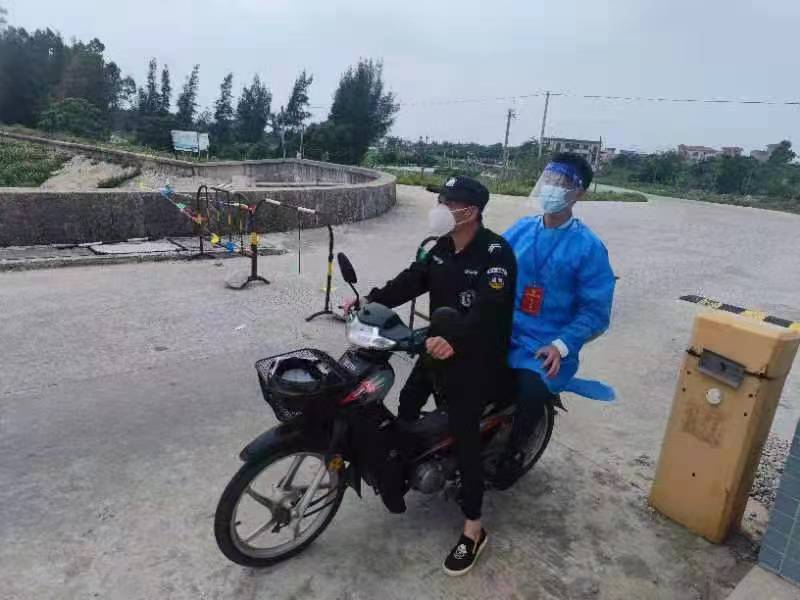 5月14日中午,下起了小雨,一辆电摩从坡头镇方向向乾公路埇尾垌卡哨点开来,先锋队员陈赤洲撑起雨伞上前检查了解情况,发现是不久前从卡口出去前往坡头区人民医院看病的本镇群众,母女俩见已下起雨便原路返回,这时蹲在车踏板上的小女孩稍微掀开罩在头上的雨衣,渗着泪念叨着“妈妈,我不舒服。”边说发抖,因共用一张雨衣,这时他们膝下的衣服已被淋湿。雨越下越大,出于安全考虑,值守人员没有直接放行,让其扫场所码进入帐篷里避雨。经与驻点民警商量并征得上级领导同意,决定用警车将小女孩送到镇卫生院就诊,同时对其母亲的违规驾载行动进行批评教育,并通知家属前往卫生院及适当时候到卡哨点开走电动车。