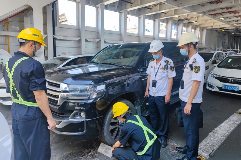 6月3日上午,执行“小客车过海专班”运输船舶“六连岭”轮装载旅客258人、车辆51台从徐闻港出港前往海口。徐闻海事处执法人员来到徐闻港15#泊位,对该轮开展现场检查,详细检查装车甲板车辆系固绑扎、人车分离和安全通道预留等情况,督促船员严格落实驾驶台值班、船舱巡舱打卡制度。同时,海事部门加强船舶交通动态监控,通过船舶电子巡查和交通组织等,“点对点”服务保障“小客车过海专班”船舶进出港安全,全力维护琼州海峡客滚航线通航秩序。在海安新港,海事执法人员加强装车现场秩序维护,并协助行动不便的乘客登船。