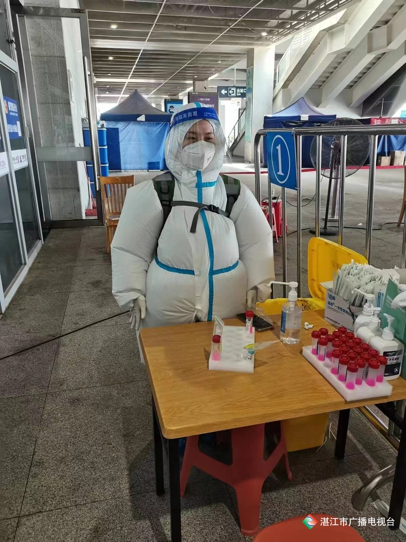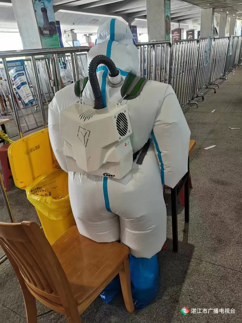 麻章车站核酸检测点的医务人员告诉记者,以前穿防护服感觉非常闷热,防护服一脱全身都会湿透。现在背着“空调”坐在核酸采样棚里,防护服里一直有冷风吹着,感觉舒服多了。
