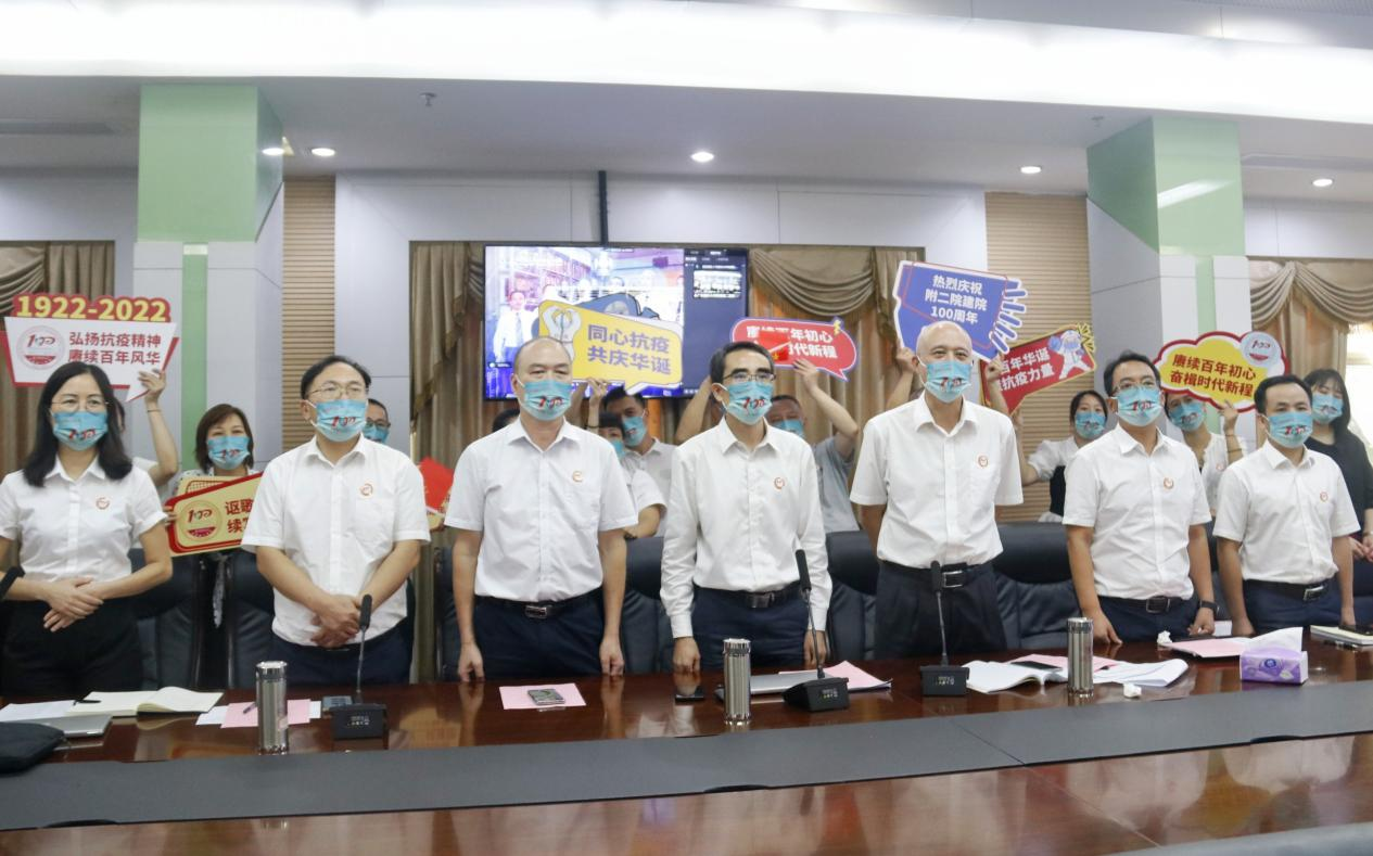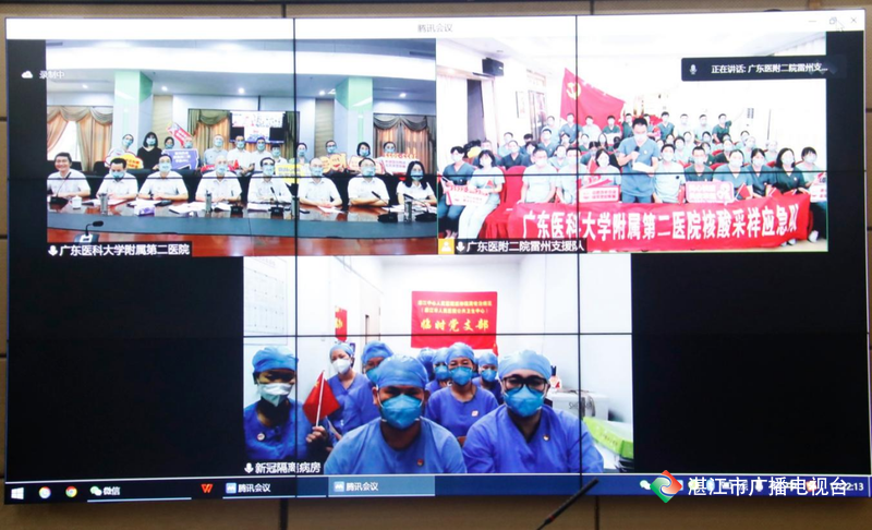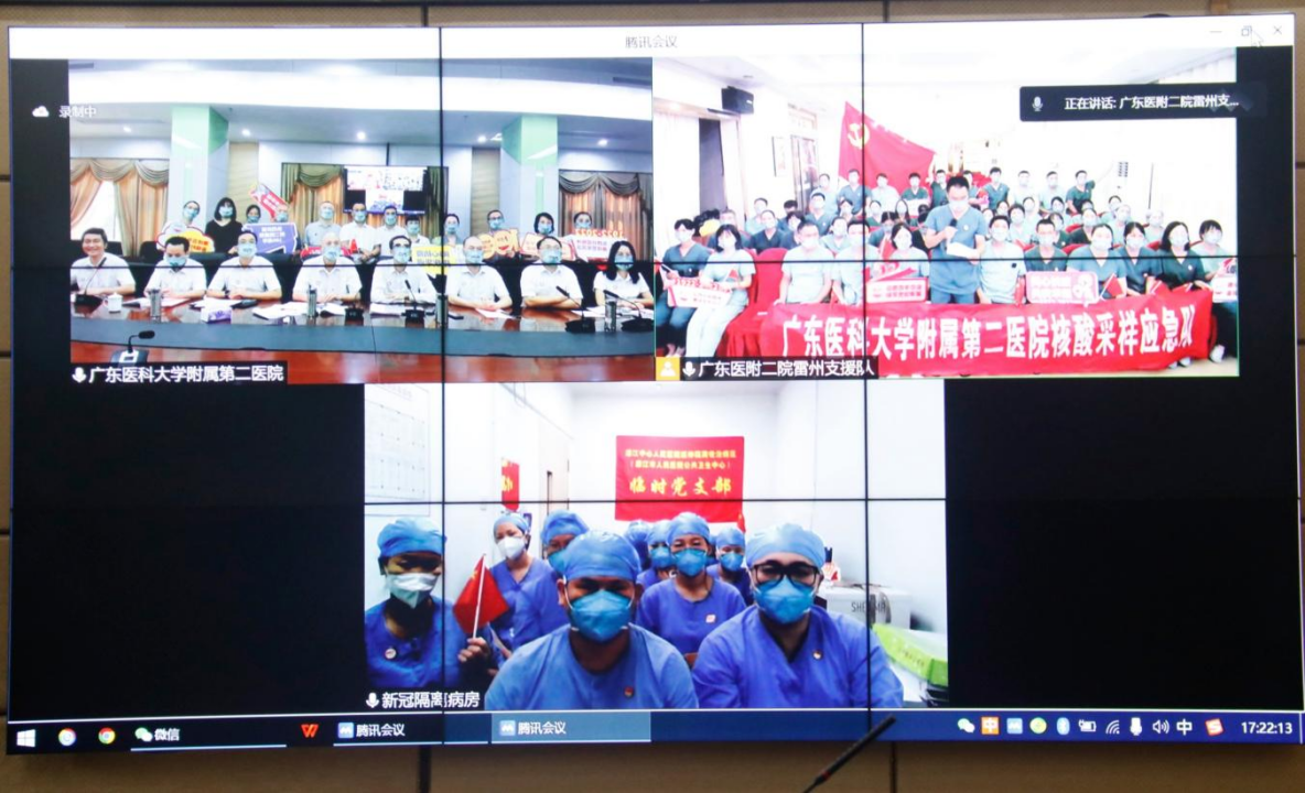 8月18日下午,广东医附二院以视频方式连线此时正在雷州抗疫一线的核酸采样应急队和正在廉江工作的广东医附二院医疗队,向他们致以百年院庆和医师节的热烈祝贺,向他们不怕辛苦、连续作战,始终奋战抗疫一线表示崇高的敬意。