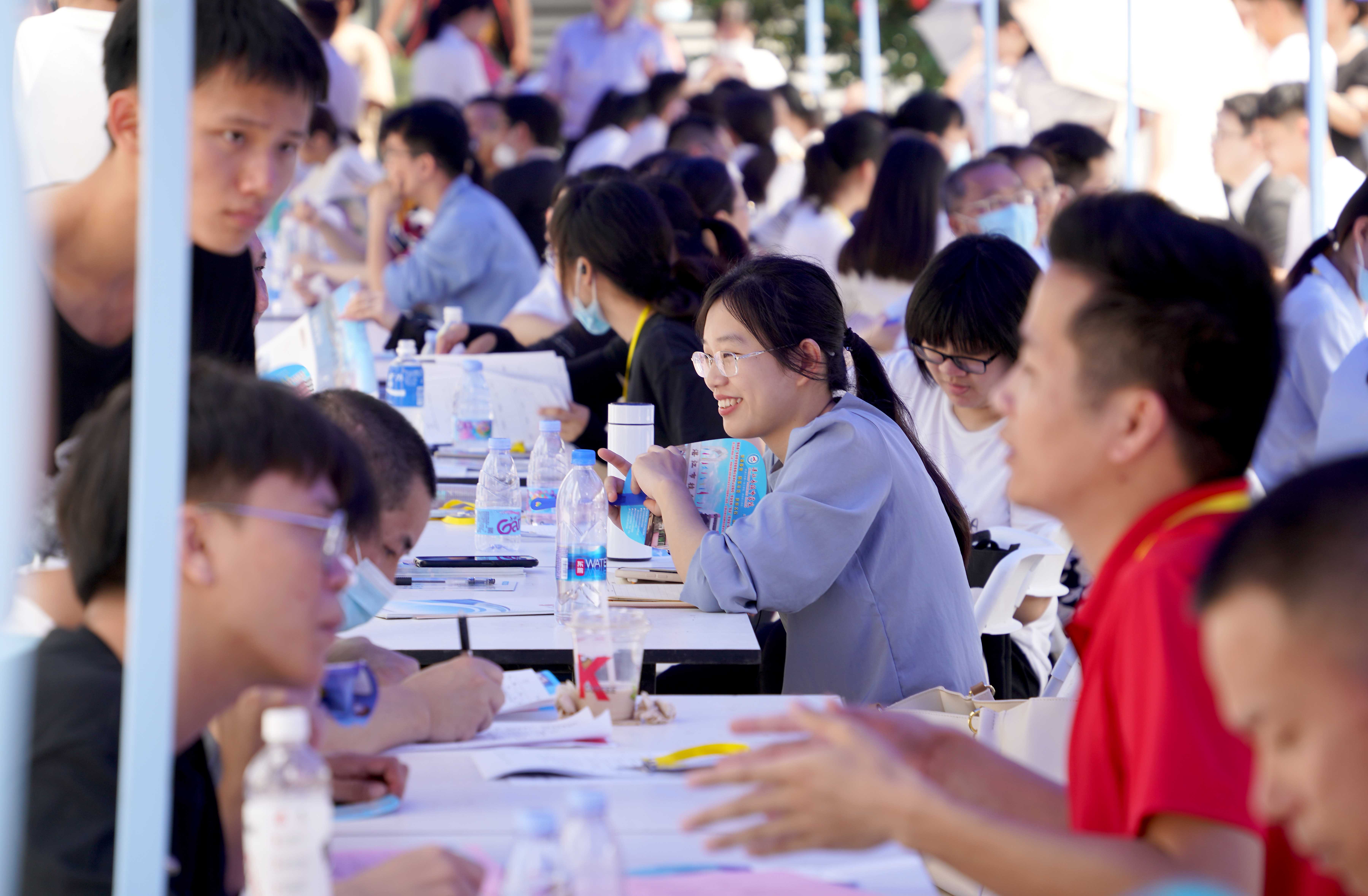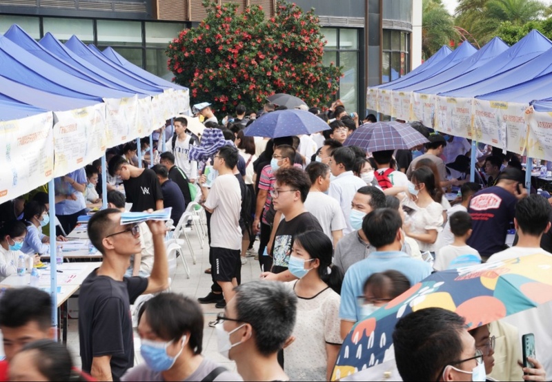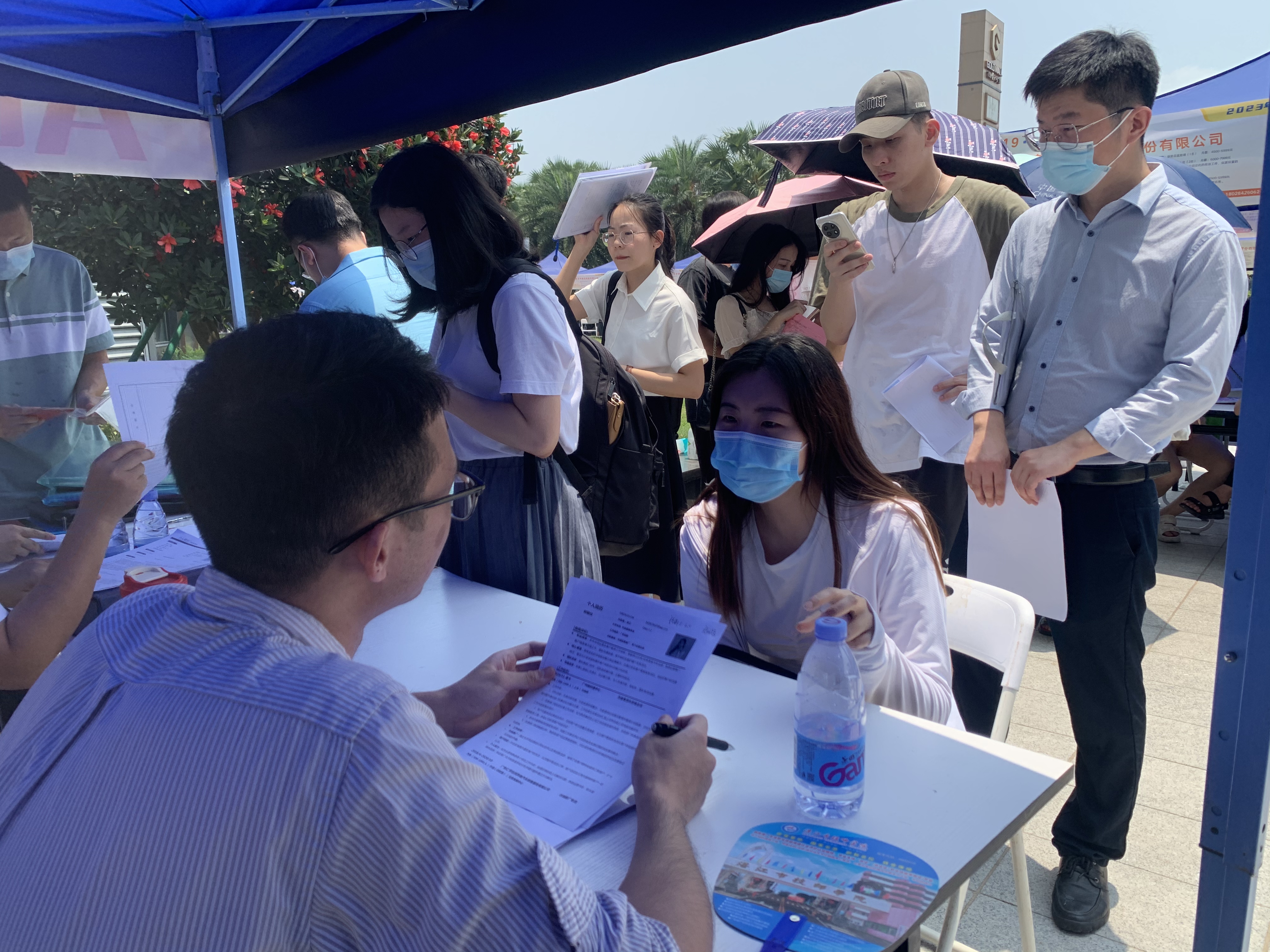 5月21日, 由省人力资源和社会保障厅和湛江市政府联合主办的2023年广东“稳就业促发展”粤西片区大型招聘活动在湛江万象金沙湾广场举行,243家企业进场招聘,提供近8000个岗位,月薪普遍在5000元左右,个别高端职位达到月薪近3万元,吸引了大批求职者进场应聘。