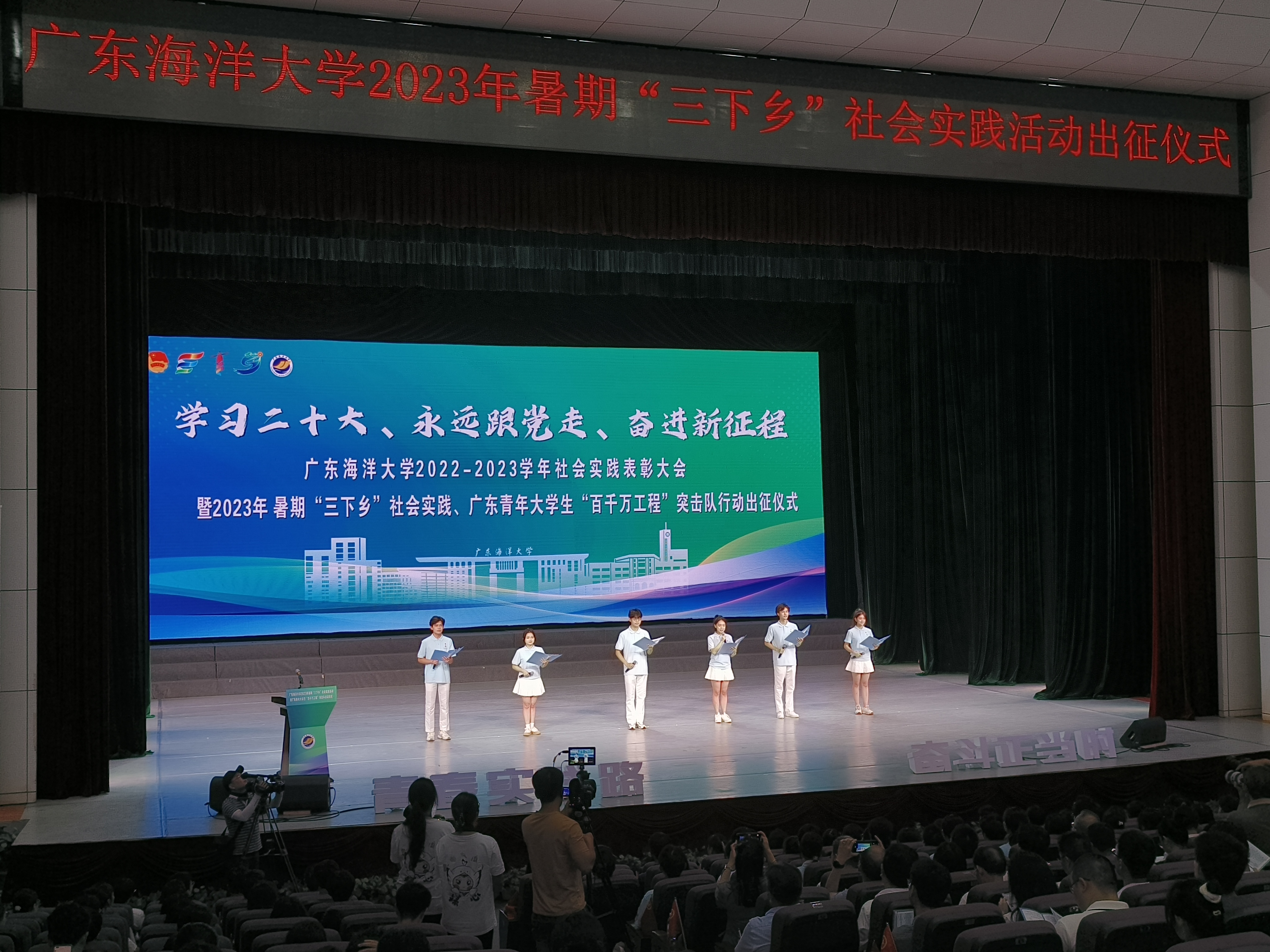 6月30日,广东海洋大学举办2023年 暑期“三下乡”社会实践、广东青年大学生“百千万工程”突击队行动出征仪式。全校各专业学生组成220支团队前往广东省各市开展约14天的暑期社会实践活动,把课堂学习和乡村实践紧密结合,聚焦科技兴农,厚植爱农情怀,为助推广东高质量发展凝聚海大力量。