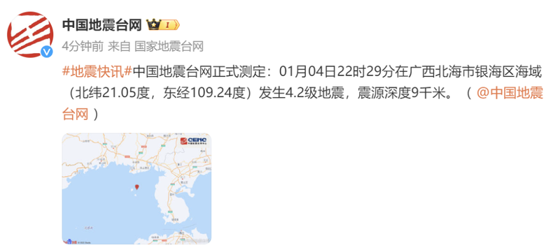 稿件来源:中国地震台网、湛江发布融媒体编辑:刘智健责编:施显彪审核:李建文