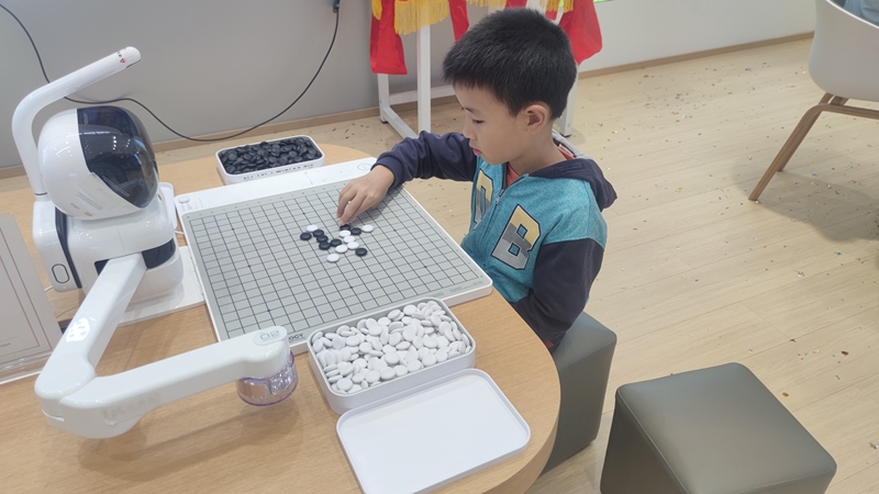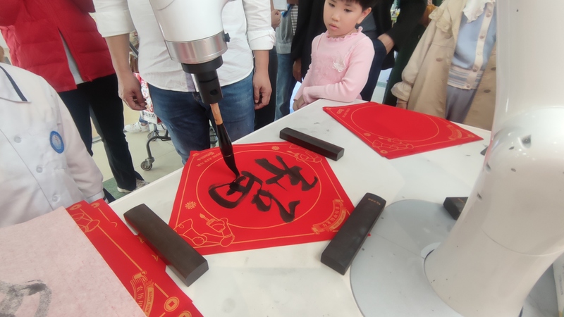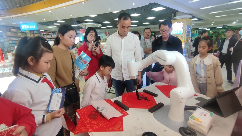 展示现场设有“与未来对话”和“AI书法机器人”等体验区。孩子们挤在虚拟爱因斯坦跟前,争相参加由爱因斯坦发起的知识问答挑战,并与机器人一起下围棋。AI书法机器人展区旁同样挤满了好奇的孩子,只见机器人先是抬笔蘸墨,然后在纸上挥毫泼墨,一幅幅不同字体的福字展示在大家面前,孩子们被这位AI书法家的书写技能深深折服。