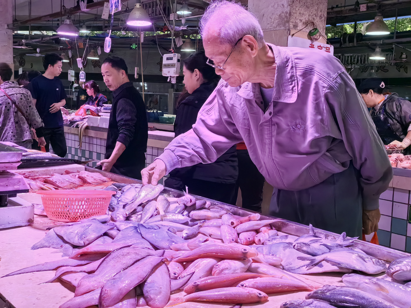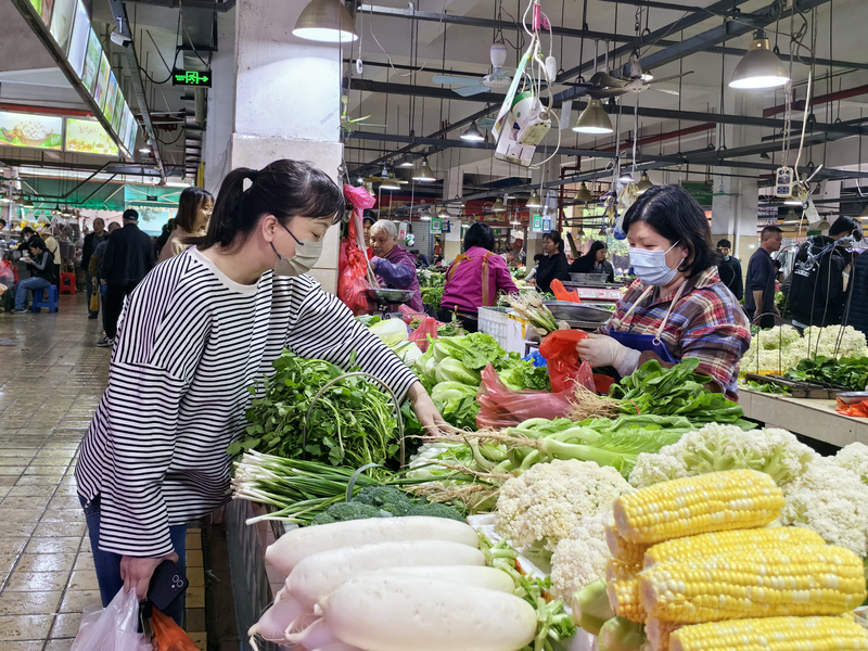 北桥市场内,人群熙熙攘攘。蔬果、海鲜、猪肉等摊位呈现一派繁忙的景象。蔬菜摊位上,在北桥市场经营了13年的摊主劳女士正在忙碌着手中的活计,她一边称重、结算,一边热情地招呼顾客。谈起最近的生意,劳女士开心地表示,春节快到了,生意更红火了,虽然辛苦了一点,但是收入也在增加。