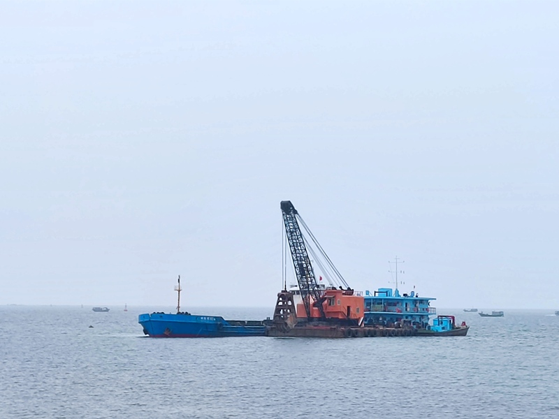 3月29日,在湛江海事部门的服务保障下,抓斗船“粤富隆浚0028”轮在码头附近水域抓起第一斗泥,标志着湛江港宝满港区集装箱码头一期扩建工程正式开工。