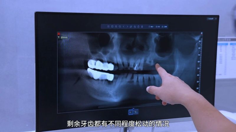 “缺多种少”意思是通过植入较少的种植体来平衡牙齿的咬合关系,达到恢复咀嚼功能的目的,像这名患者拔除无法保留的松动牙后,在合适的位置植入4颗种植体来恢复7颗缺牙的咀嚼功能。
