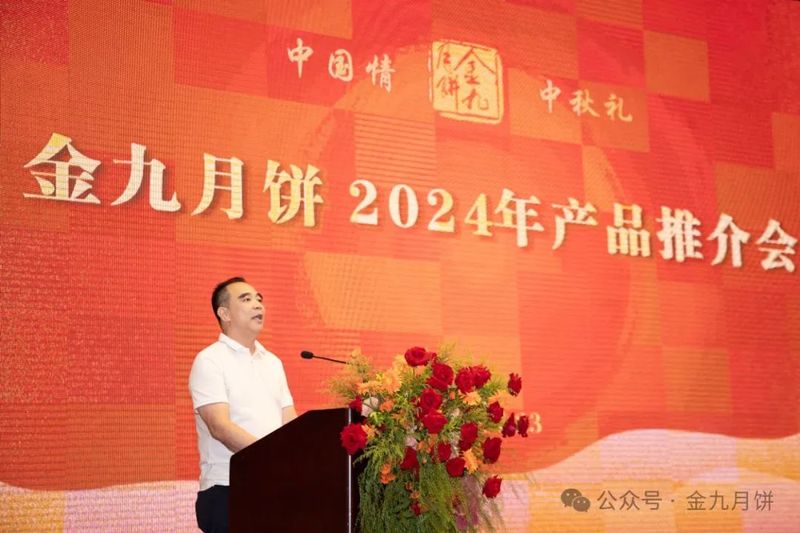 推介会正式开始,金九集团董事长郑日康先生致辞,对到场的领导、嘉宾以及合作伙伴表达了热烈的欢迎和诚挚的谢意,并向大家介绍了金九月饼的发展历程、品牌理念以及2024年新品的卖点。