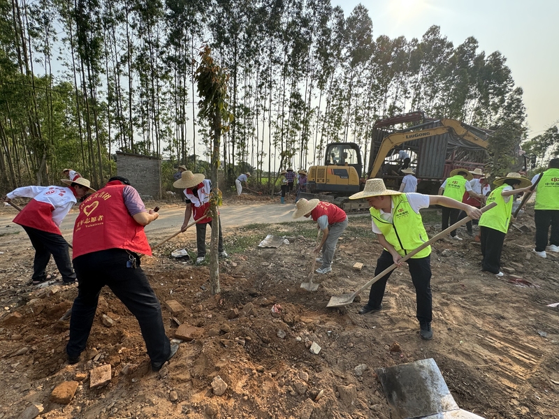 在植树地点,参加活动的党员干部、村两委干部、群众代表一同挥锹铲土、扶苗培土、围堰浇水,合力种植红花紫薇树、荔枝树等1200株,用辛勤劳动为湛江大地再添新绿。