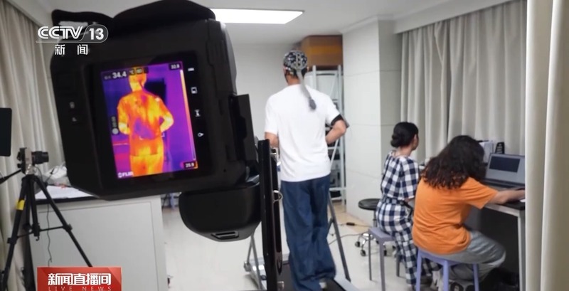 记者走访了该实验室,一名志愿者正头戴传感器,在跑步机上运动。脑电仪、红外热成像仪等设备正实时记录人体在特定环境下、穿着服装后的各项指标数据。