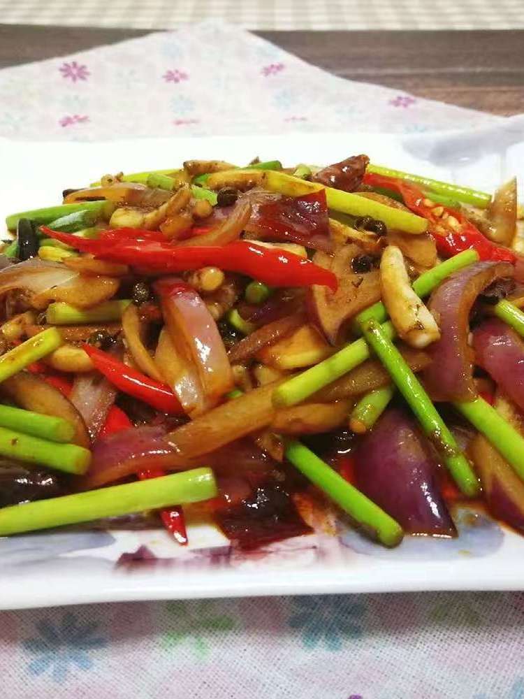 1. 鱿鱼焯水后爆炒,加入蒜苔和洋葱翻炒。