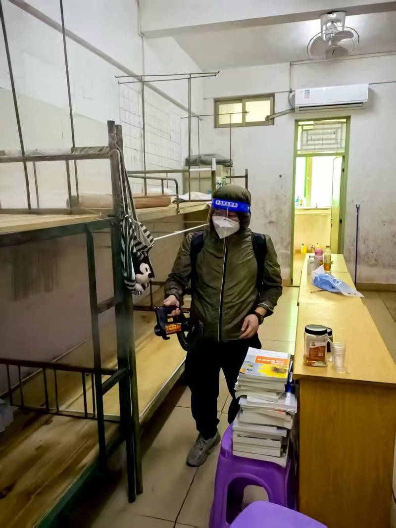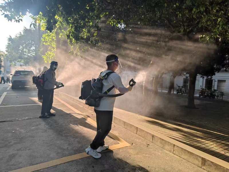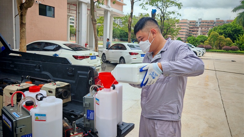 在湛江市第七中操场上,专业消杀人员身着防护服,手持背负式喷雾器,对教学楼周边的下水道、绿化带开展立体式消杀。教室内,工作人员重点对墙角、柜后等隐蔽部位进行喷洒作业,全方位清除蚊虫孳生环境。