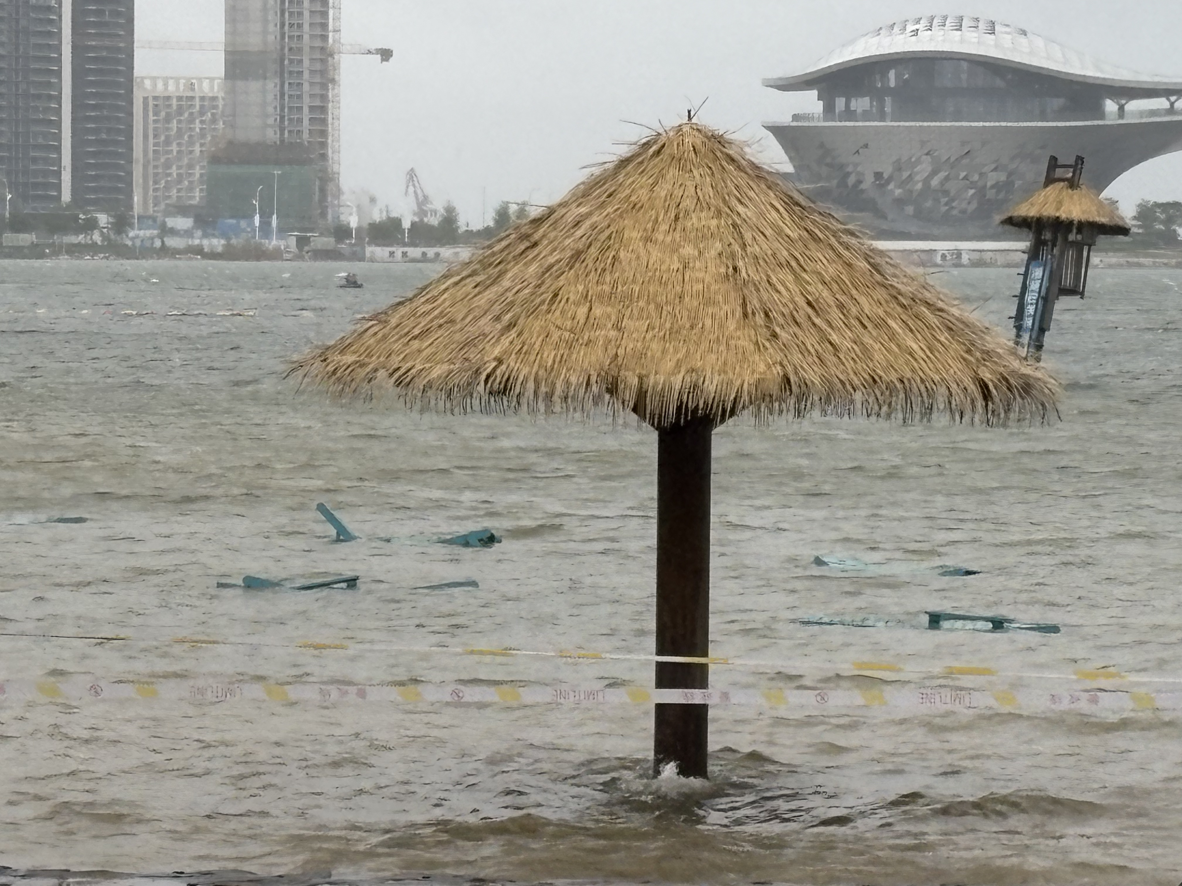 上午10点,记者在金沙湾景区看到,景区已全面关闭,海水涨到岸边,没过整个海滨浴场,海面不断翻起涌浪。