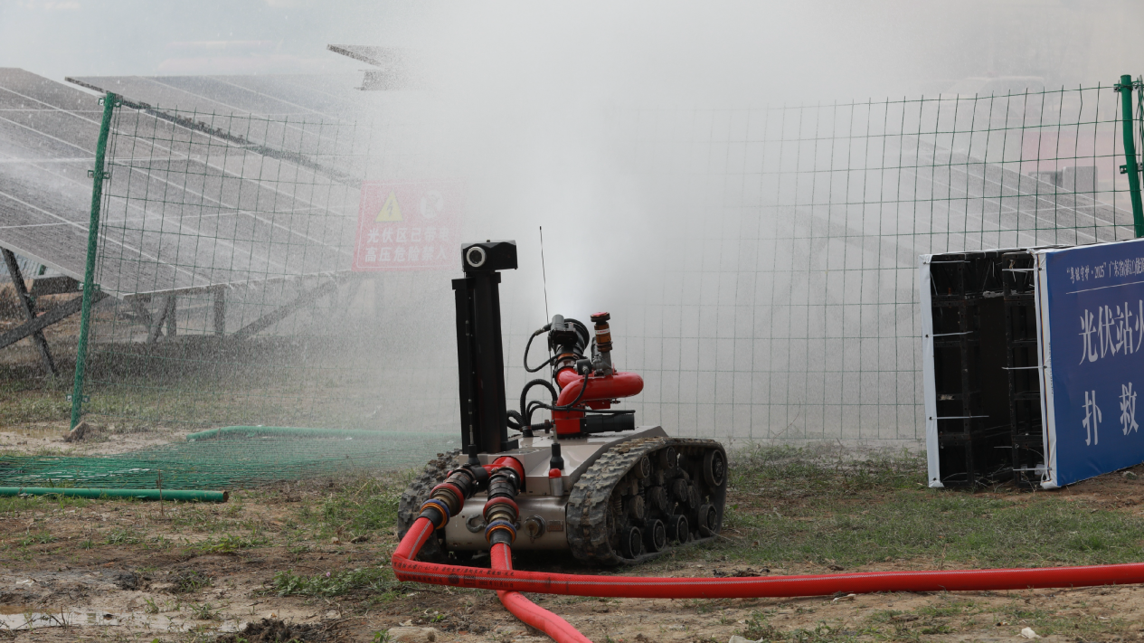 本次演练最大亮点是:无人机、灭火机器人、无人驾驶收油船等一系列科研成果以及应急抢险新技术的综合运用,为应急救援提供了更新、更有效的手段,特别是在光伏电站火灾扑救环节,通过侦查机器人进入火场侦查,无人机空中侦察火情,实时回传数据,指挥中心精准研判后调度消防机器人抵近作业,实现了“人、机、云”协同作战,有效遏制火势蔓延。