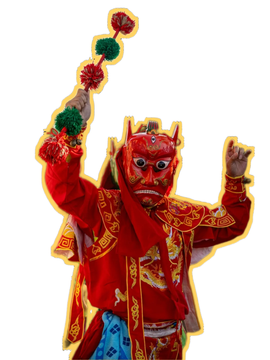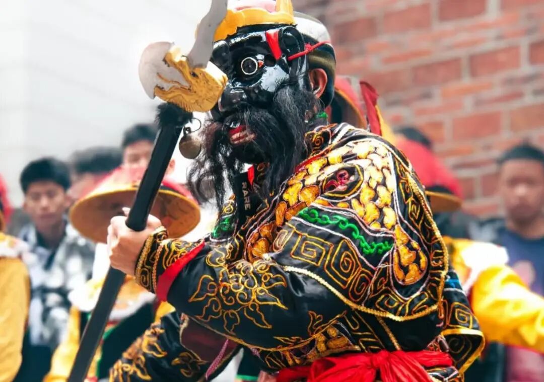 随着色彩浓烈、神态威严的面具舞动