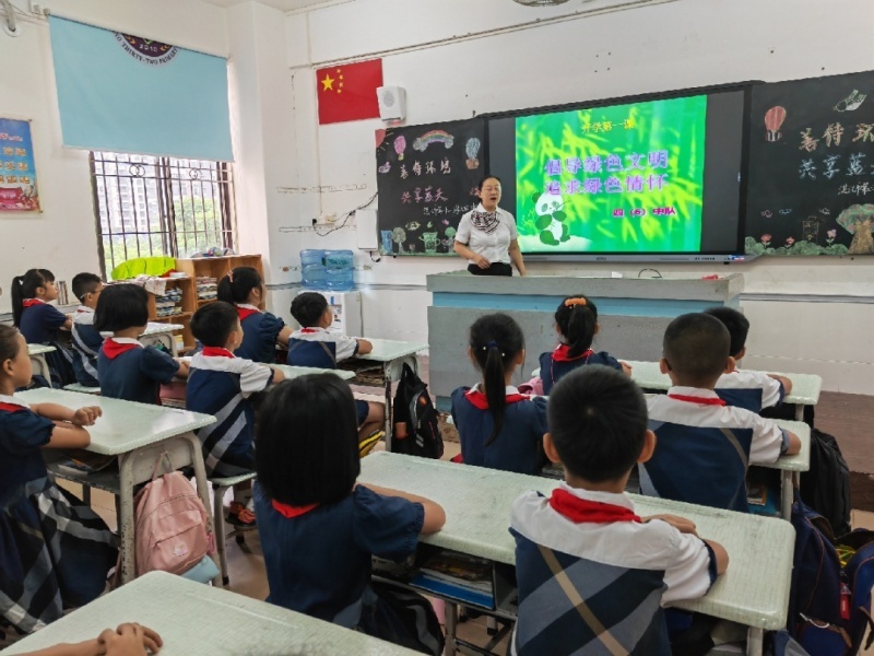 开学第一天,湛江市第三十二小开展“倡导绿色文明,追求绿色情怀”班会课,以身边点滴小事引导同学们珍爱环境,把“青山绿水”环保理念播撒在孩子们心里。