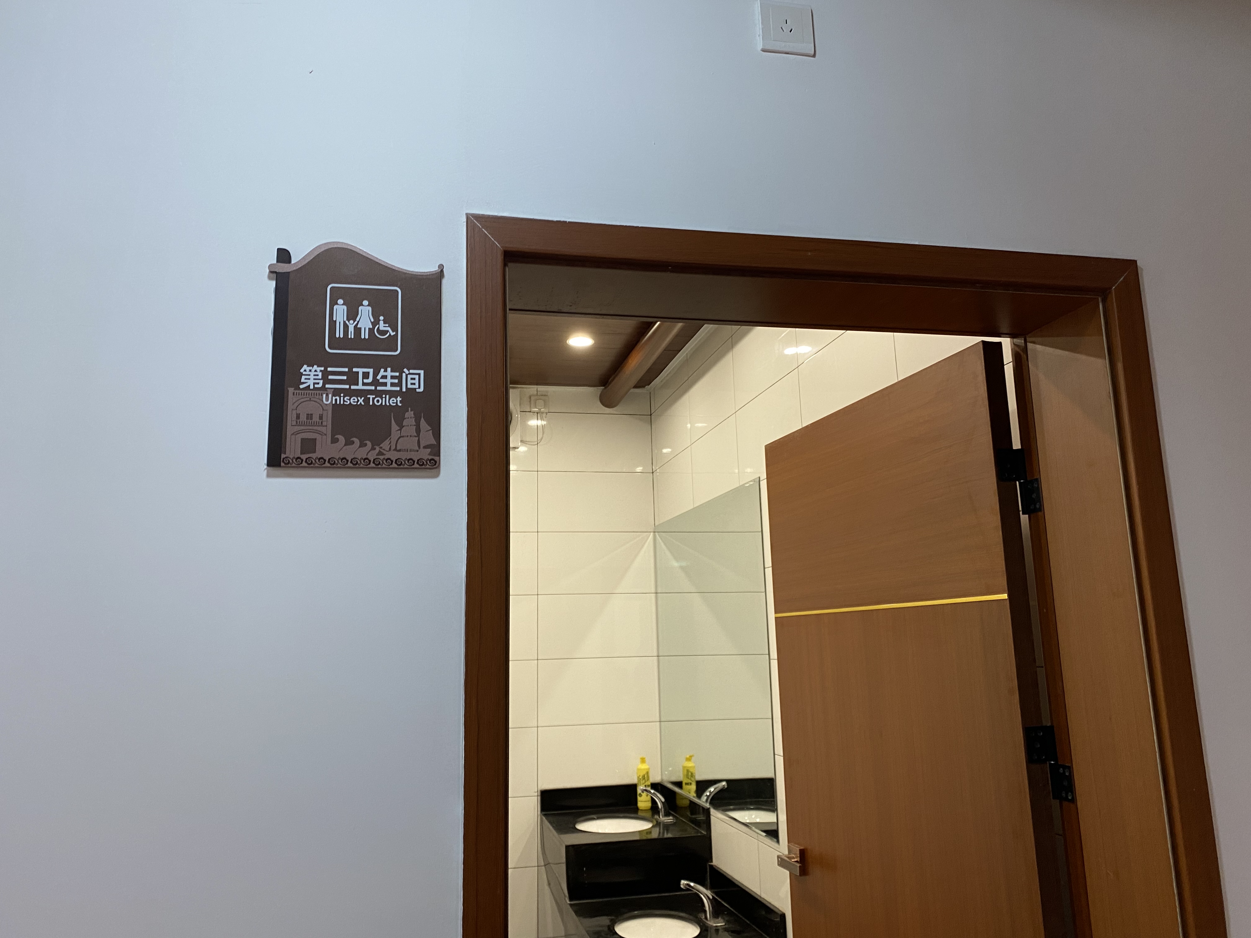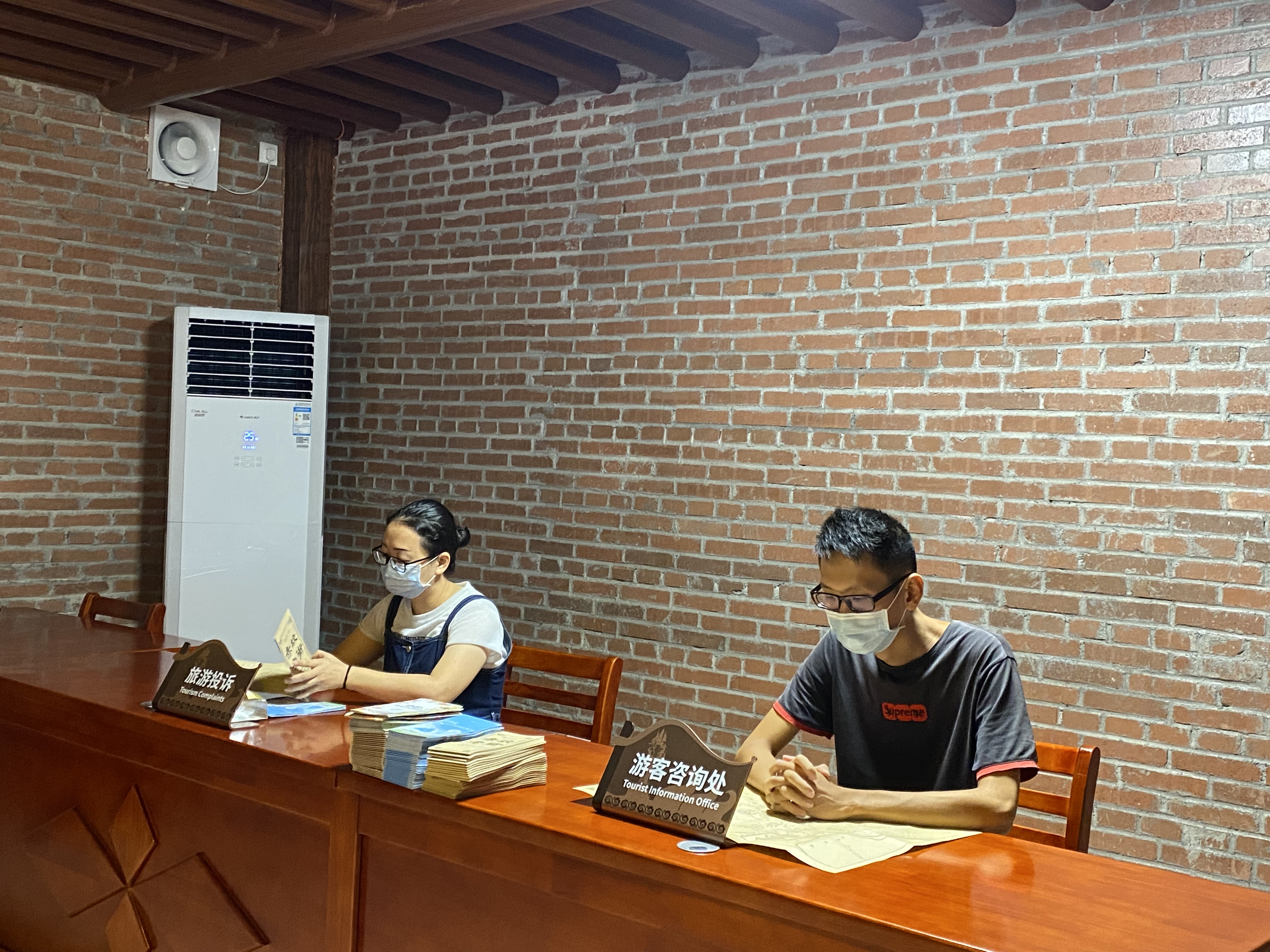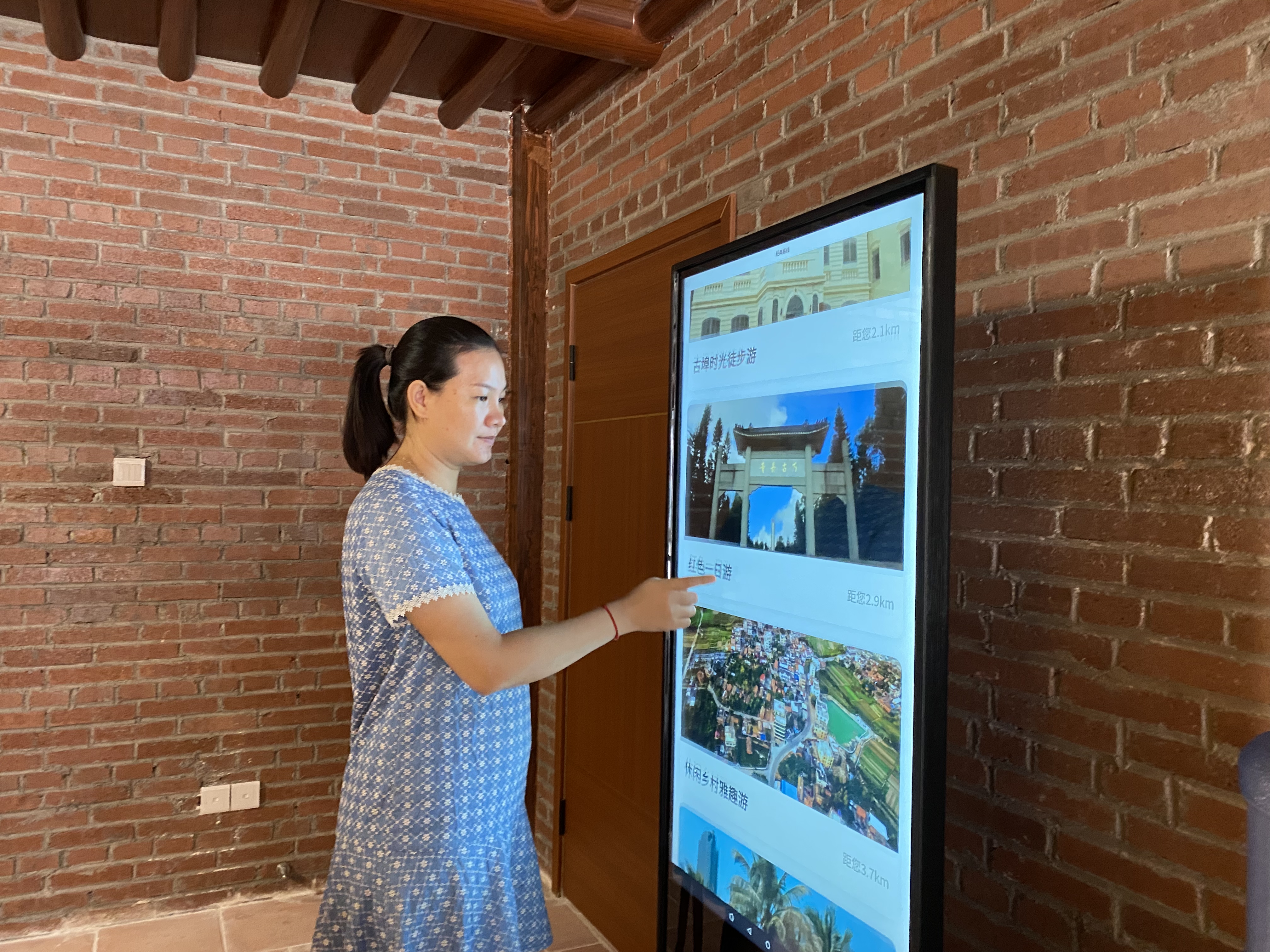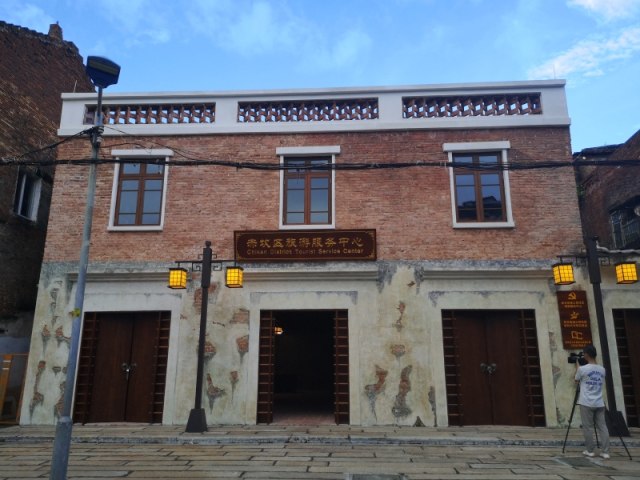 红砖墙,棕红色木门,透着暖黄光的中式路灯,新建成的赤坎区旅游服务中心古香古色,与人文底蕴深厚的赤坎老街气质吻合,相得益彰。该中心具有引导、服务、游憩、集散等功能,内设旅游产品展示销售区、休闲区、医务室、母婴室、游客投诉室等功能室。此外,还专门设置了为行为障碍者或协助行动不能自理的亲人(尤其是异性)使用的“第三卫生间”,帮助解决特殊游客群体的如厕需求,体现人文关怀。游客来到这里,还可以取阅赤坎老街手绘商业地图、赤坎美食手绘地图和全域旅游全景图等宣传小册,通过多功能触控一体机,轻松获得赤坎“吃住行游购娱”信息服务。