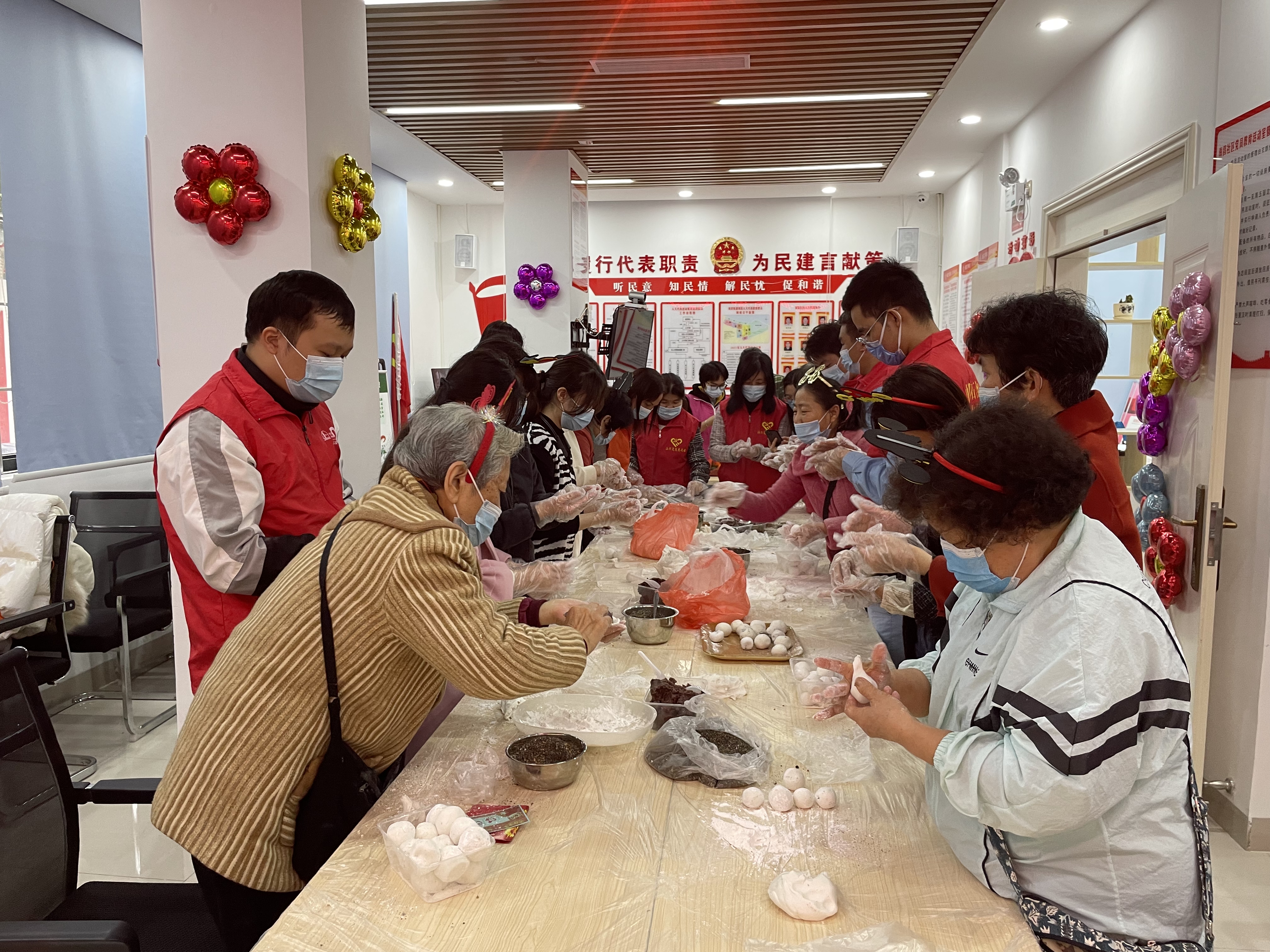 活动现场热闹非凡,社区工作人员拿出提前准备好的糯米粉、黑芝麻馅、花生馅等,与居民们在欢快的气氛中包起了汤圆。