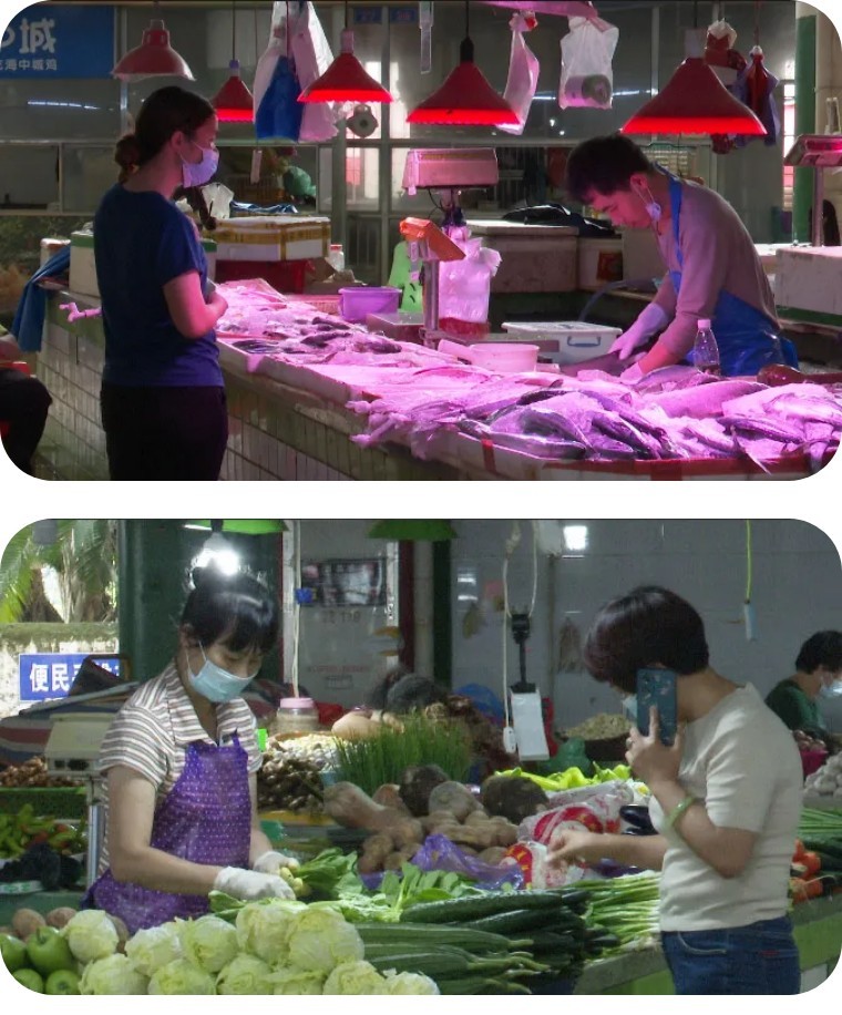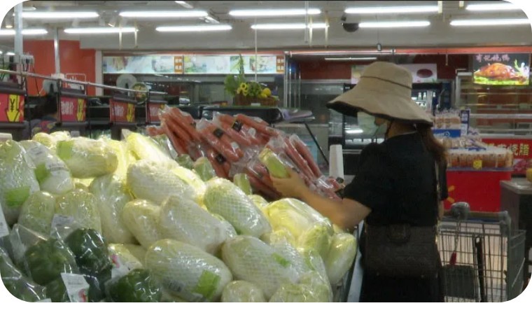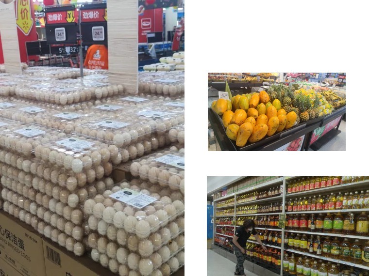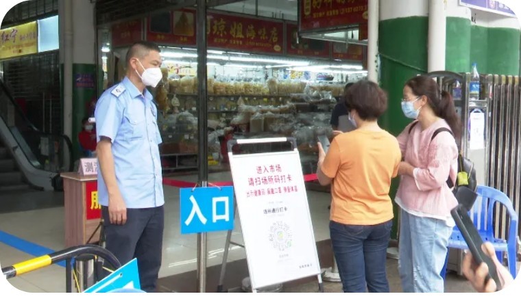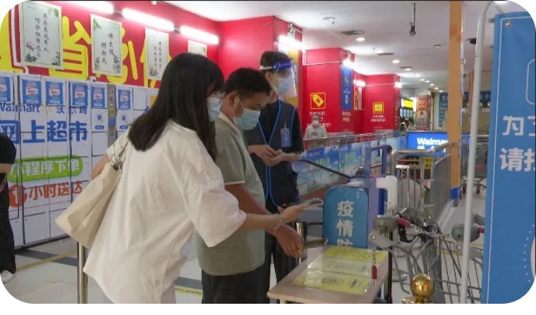 市民在超市门口扫场所码超市里货架上的货物品种多样