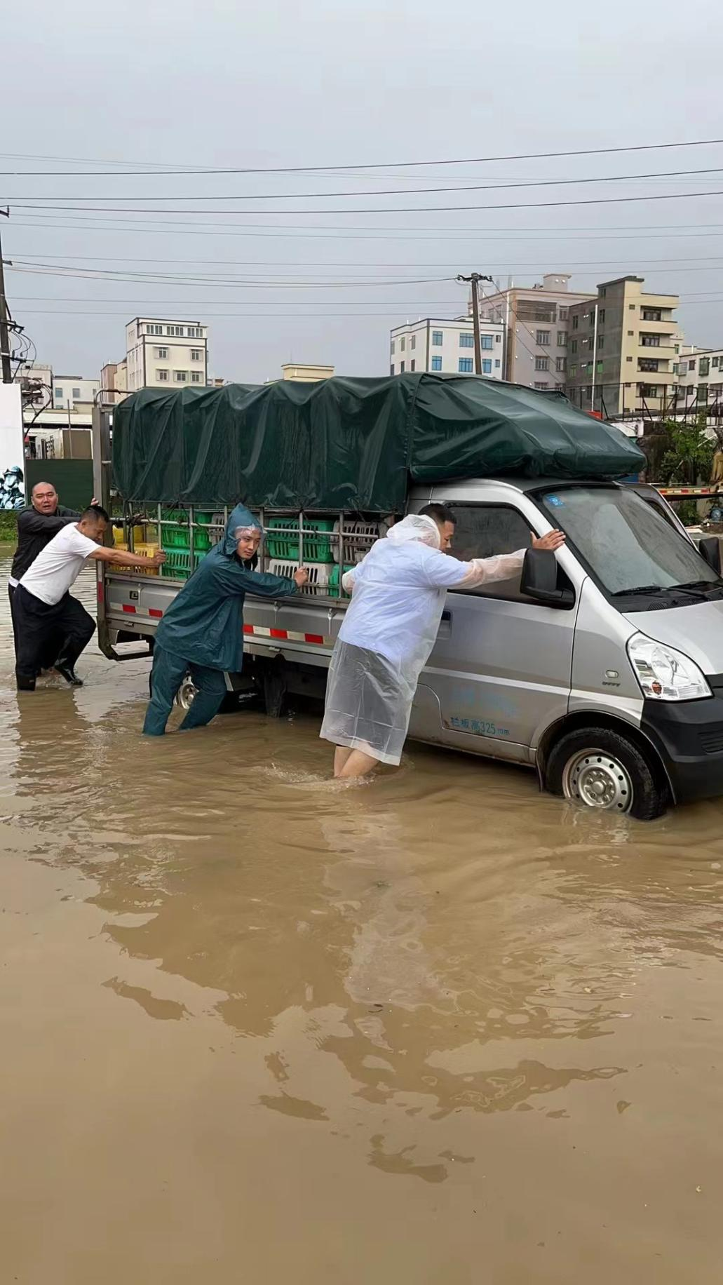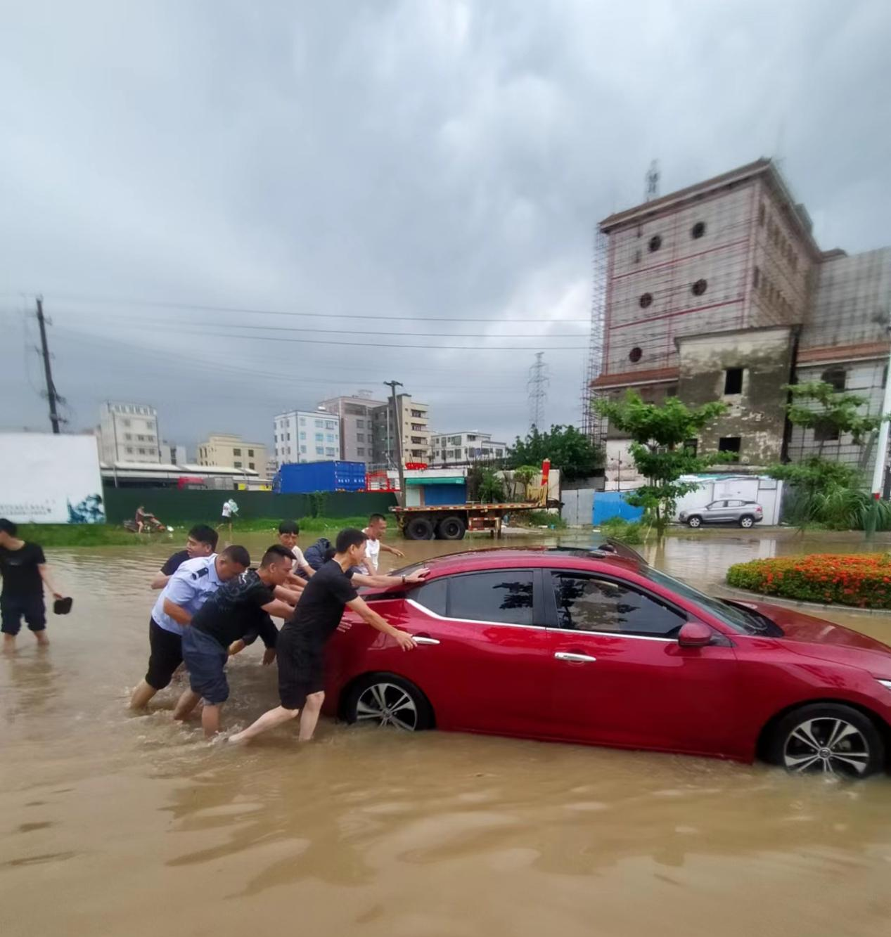 在百蓬路段,有市民行车中在积水路段熄火,在附近值班值守的建设街道工作人员第一时间上前帮忙将车辆从水潭中推出。