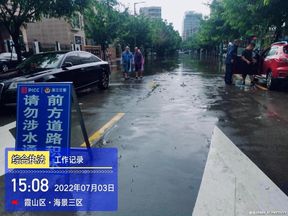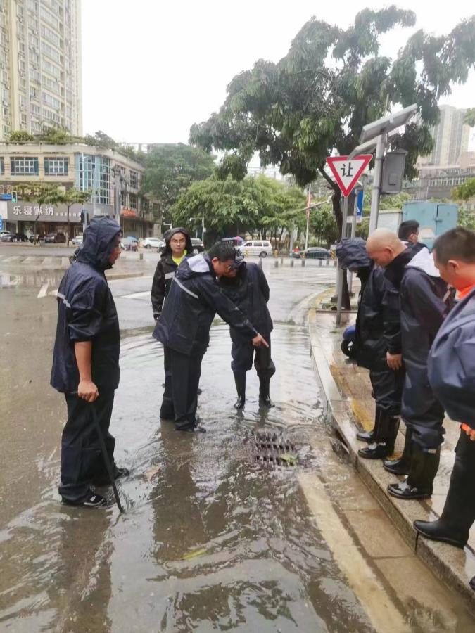 区城综局安排人员对城市道路及市政设施安全隐患进行排查,对内涝点的排水口开展清淤工作,保障雨水能快速排出;同时组织人员加强对市区绿化树木的巩固和巡查工作,并在低洼积水路段竖起警戒牌,提醒过路司机绕路行驶。