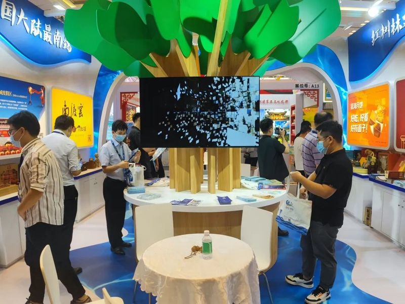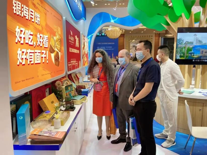 湛江馆以红树林之城命名,展区内,威猛而娇憨的醒狮摆件,古朴精巧的陶器,香气扑鼻的月饼、辣酱,以及鲜香美味的海鲜干货共同绘就了亮眼的湛江文旅名片,一批又一批参观者在品尝湛江特色美食的同时,也充分领略“红树林之城”“中国海鲜美食之都”的独特风情。