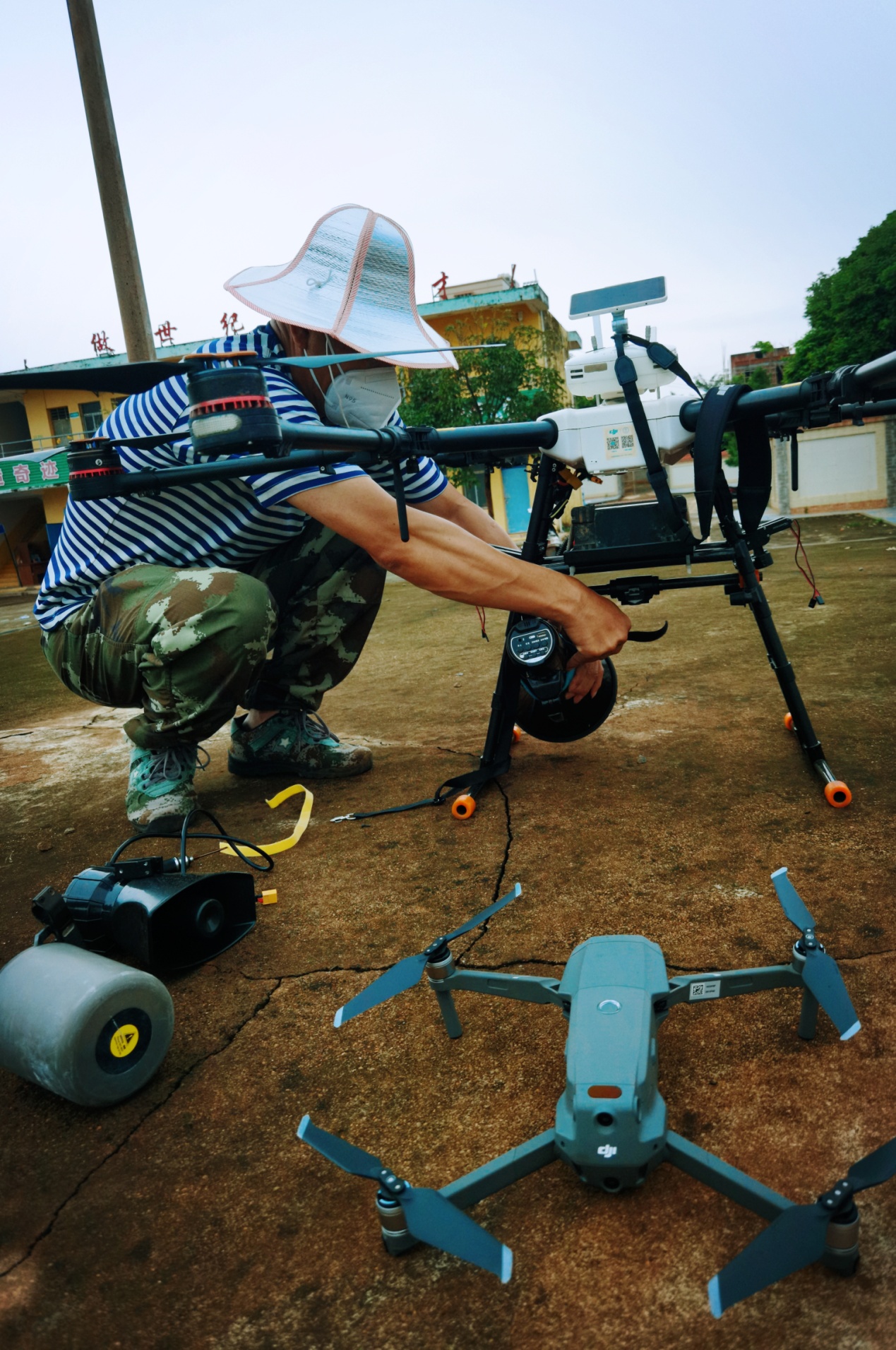 携带播音器的无人机准备起飞