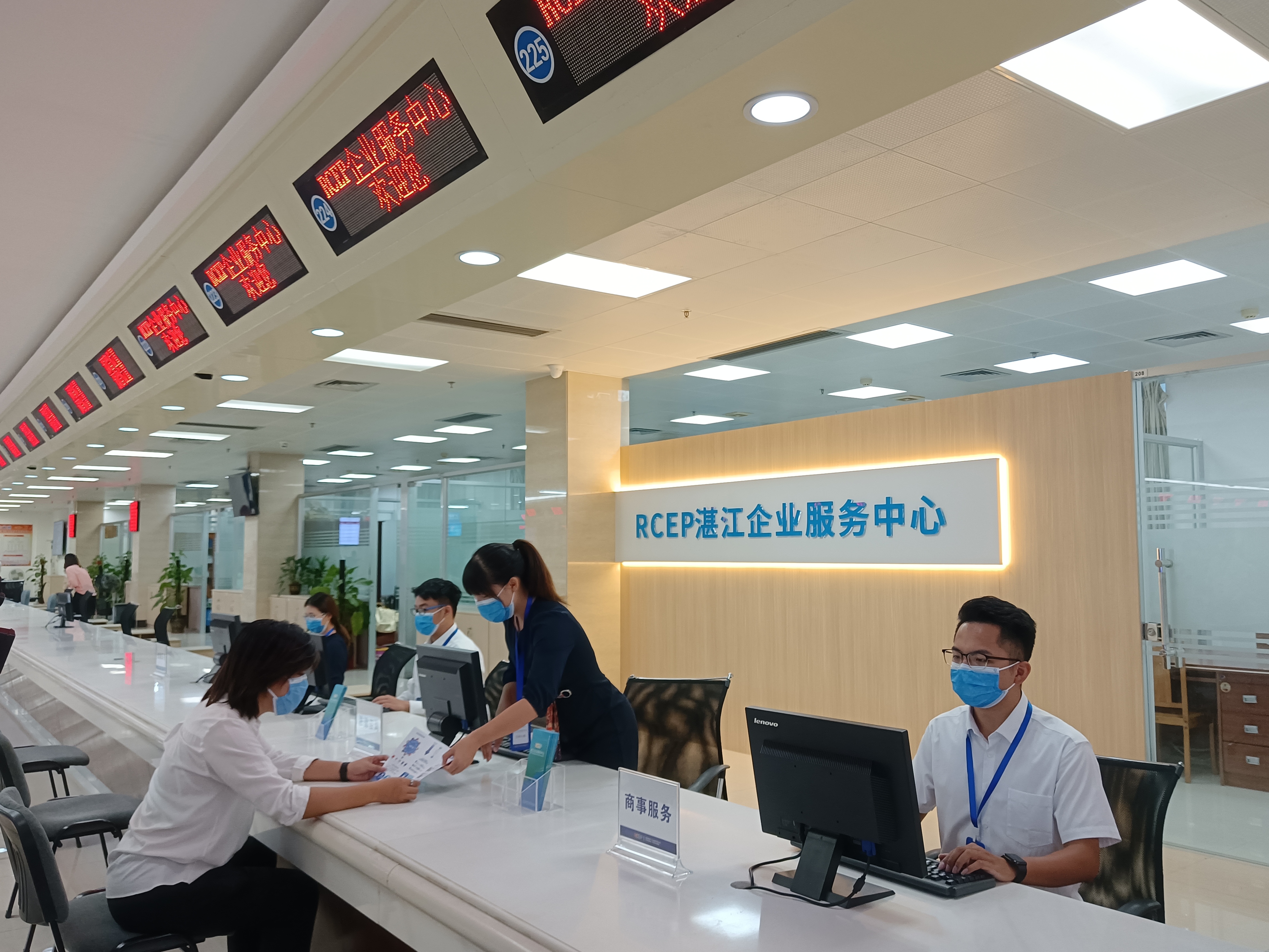 RCEP湛江企业服务中心依托在湛江市行政服务中心二楼专区,在为企业提供行政审批、税务、商事证明等便捷的政务服务同时,还将根据RCEP市场及RCEP成员国经贸核心业务,与各类贸易、金融、法律等机构深度合作,不断完善服务体系,为企业提供贸易运输保险、国际贸易物流、信用保险、企业培训、会展会务、普惠金融、涉外法律顾问等外贸商事配套服务和增值服务。