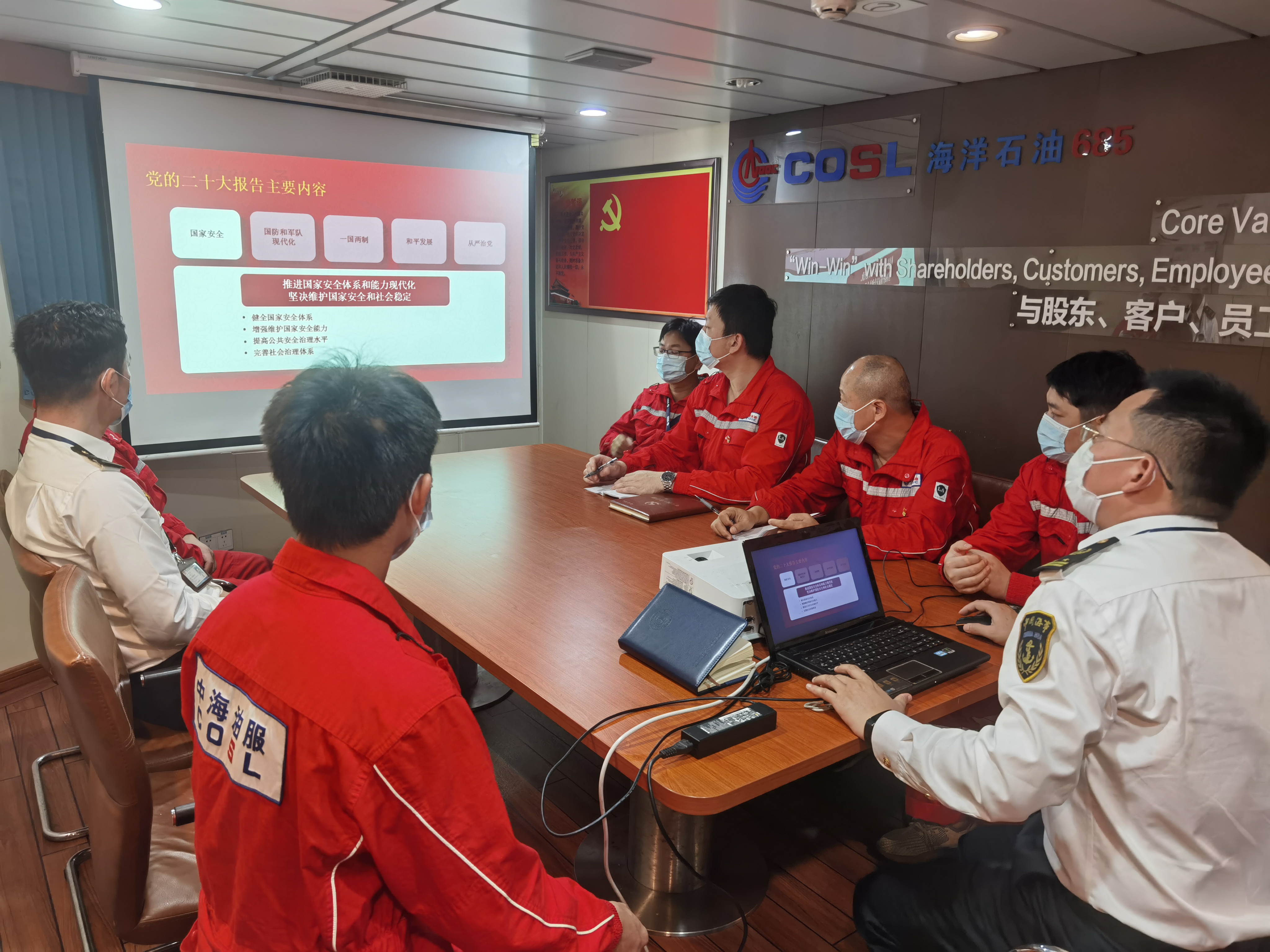 11月25日上午,中海油服船舶湛江作业公司所属海洋石油685船与海口海事局马村海事处共同开展了党的二十大精神联学活动。