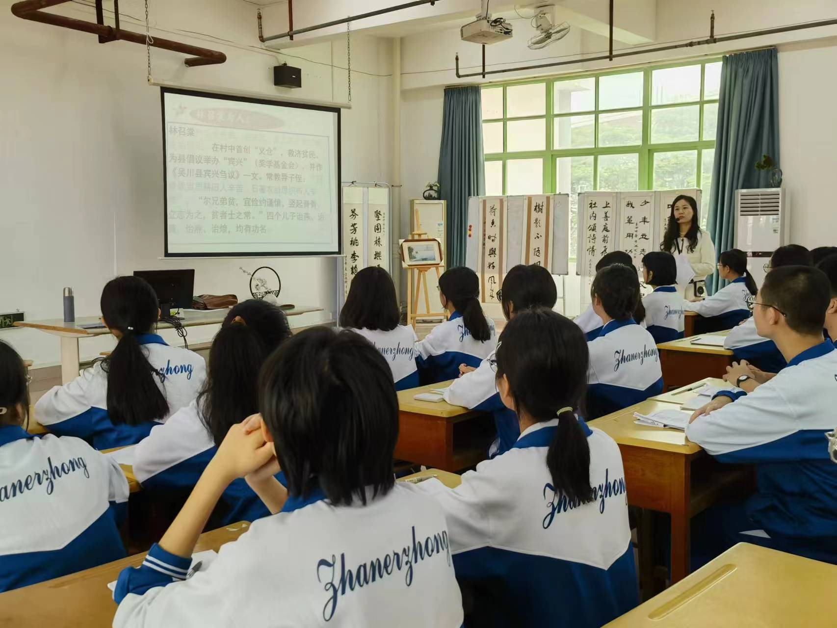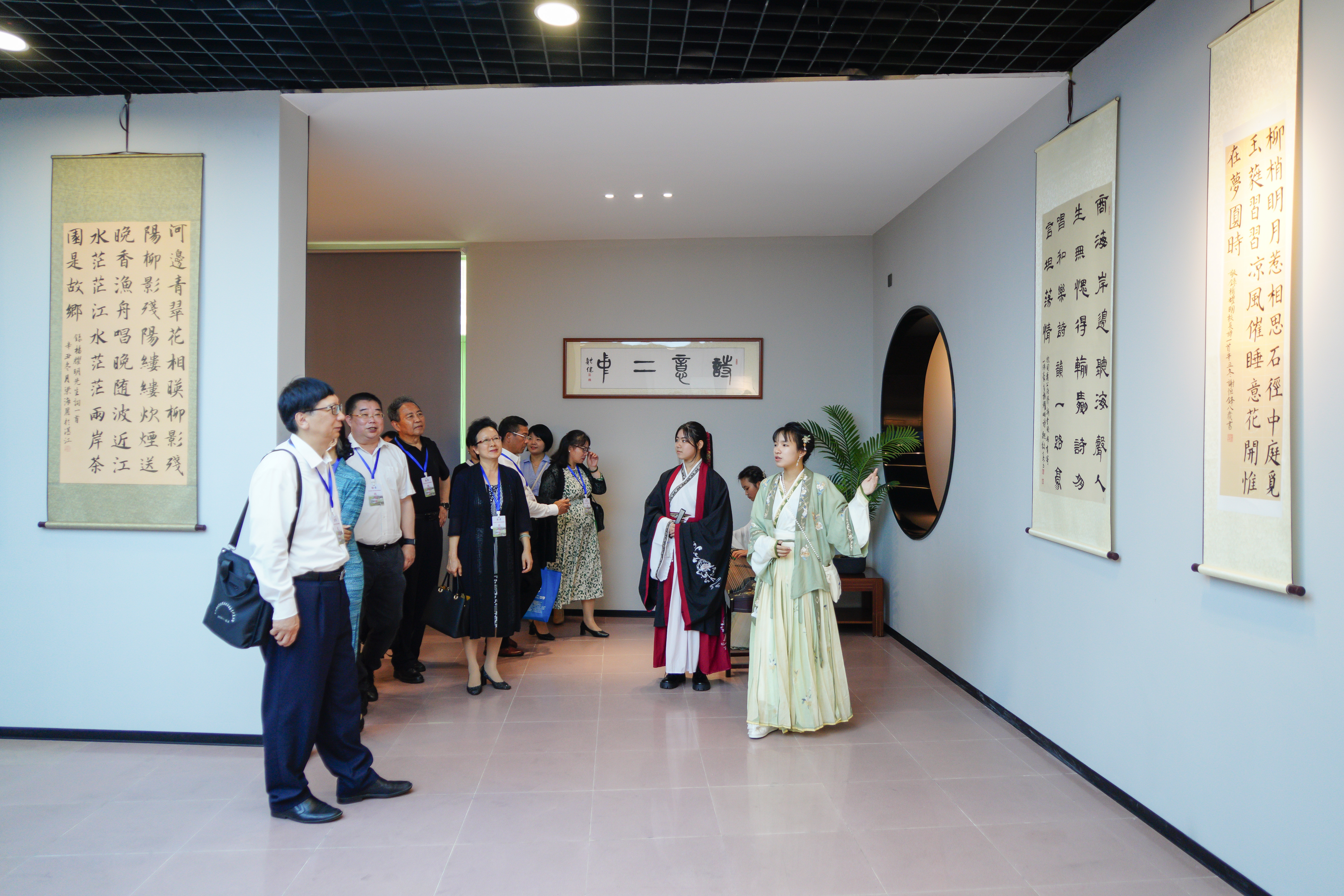 活动中,与会人员还一同观摩二中诗词与书法国画、文创产品等融合的作品展,旁听诗教课。