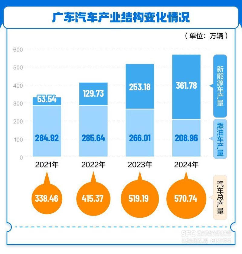 从上世纪80年代依靠合资起家,经历燃油车向新能源汽车转型,过去6年多里广东汽车产业成功实现了新旧动能衔接。据行业协会统计,2024年广东汽车总产量570万辆,比2019年增加258.5万辆,其中燃油车产量持续下滑,新能源汽车产量则从2019年的21.6万辆激增至去年的361.78万辆。五年十倍速的增长,打破了新技术革命中旧产业的老大企业、老大区域不易转身的路径锁定。