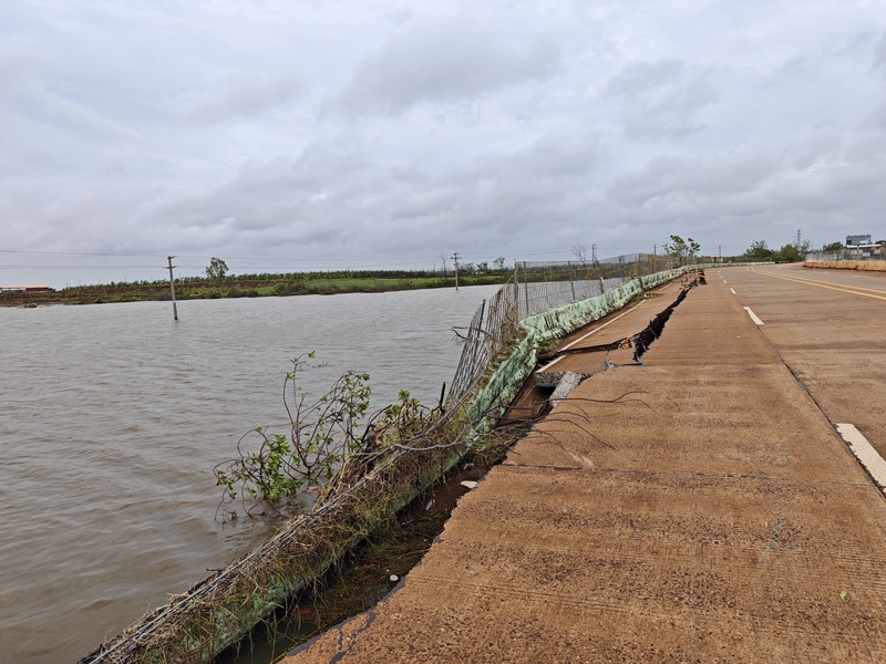 受强台风"麦德姆"影响,徐闻县省道376线大水桥水库两头水堤坝路段被冲垮约150米,导致该路段交通中断,目前已实施全幅封闭。