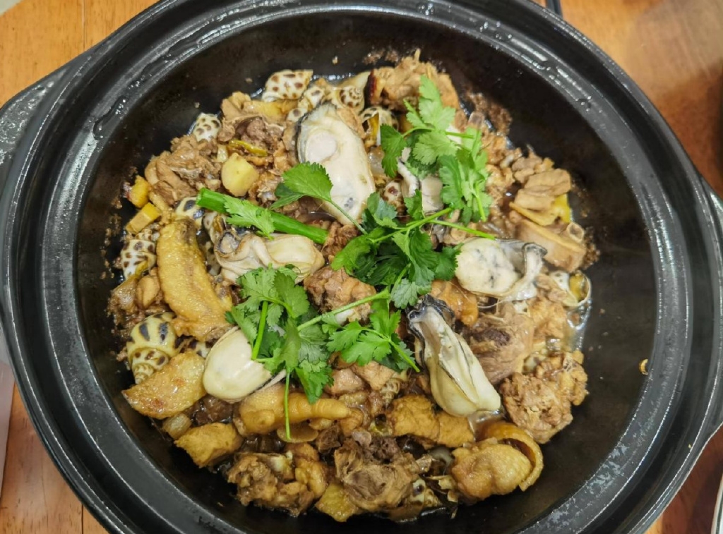 啫啫也不复杂,鸡切小块入胡椒、沙姜、蚝油、米酒腌十几分钟。砂锅烧热,下蒜头、干葱头、沙姜炒香,入鸡肉两面略煎,加盖淋入米酒,七八分钟后打开,加入生蚝或焯过水的花螺,再焖个三五分钟,撒入葱段香菜段即成。出锅前再翻炒几下,让酱汁裹满生蚝或花螺,鸡略焦、香嫩有嚼劲,多了些贝类特有的鲜味,生蚝和螺的鲜香也更复合更有层次,下酒下饭一流。