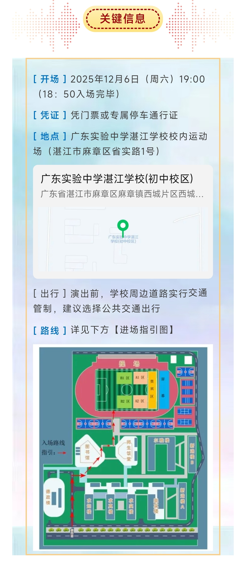 为深入落实我省“百千万工程高质量发展”部署,积极响应粤西教育帮扶工作号召,推动粤西美育均衡发展,为湛江教育提供优质美育资源,助力当地美育质量提升,切实推进区域教育帮扶落地,由广东实验中学教育集团、湛江市教育局联合主办,广东实验中学湛江学校承办的广东实验中学教育集团美育成果展演(湛江专场)将于2025年12月6日(周六)隆重举行。协同演出的还有广东海洋大学、岭南师范学院附属中学、湛江市第八小学、湛江市第三十二小学、湛江市麻章区中心小学等单位。让我们共同期待这场艺术盛宴!