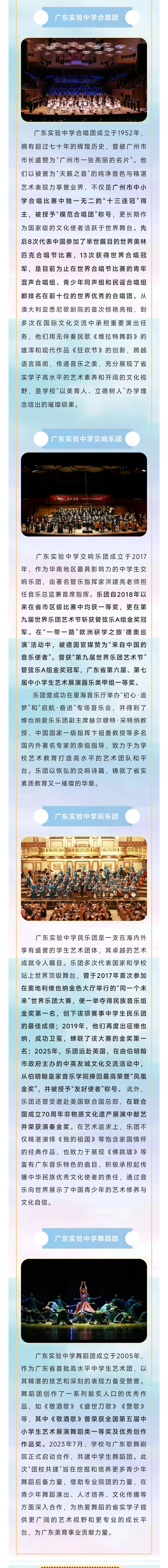 本场展演以“山海同辉·家国同心”为主题,这不仅是广东实验中学美育成果的集中展示,更是省实教育集团办学理念的生动实践。山海同辉,美美与共,这场美育盛宴,将展现省实湛江学校在“五育融合”道路上的坚实步伐,也将见证优质教育资源的共享与融合。展演将通过艺术的形式,展现省实本部与湛江学校血脉相连的深厚情谊,彰显省实人胸怀家国、追求卓越的精神风貌。