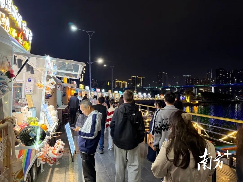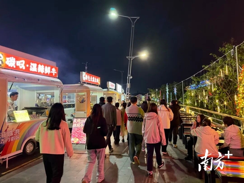 在海豚湾活力街区内,一辆辆餐车整齐排列在路边,散发着浓浓的烟火气。餐车上的招牌灯光与不远处的海湾大桥灯影交相辉映,成为夜色中颇具人气的取景点。有人举起相机捕捉餐车与大桥同框的画面,有人拿着一杯柠檬茶,站在海湾边与海湾大桥合影,把这座城市的夜晚定格在镜头里。