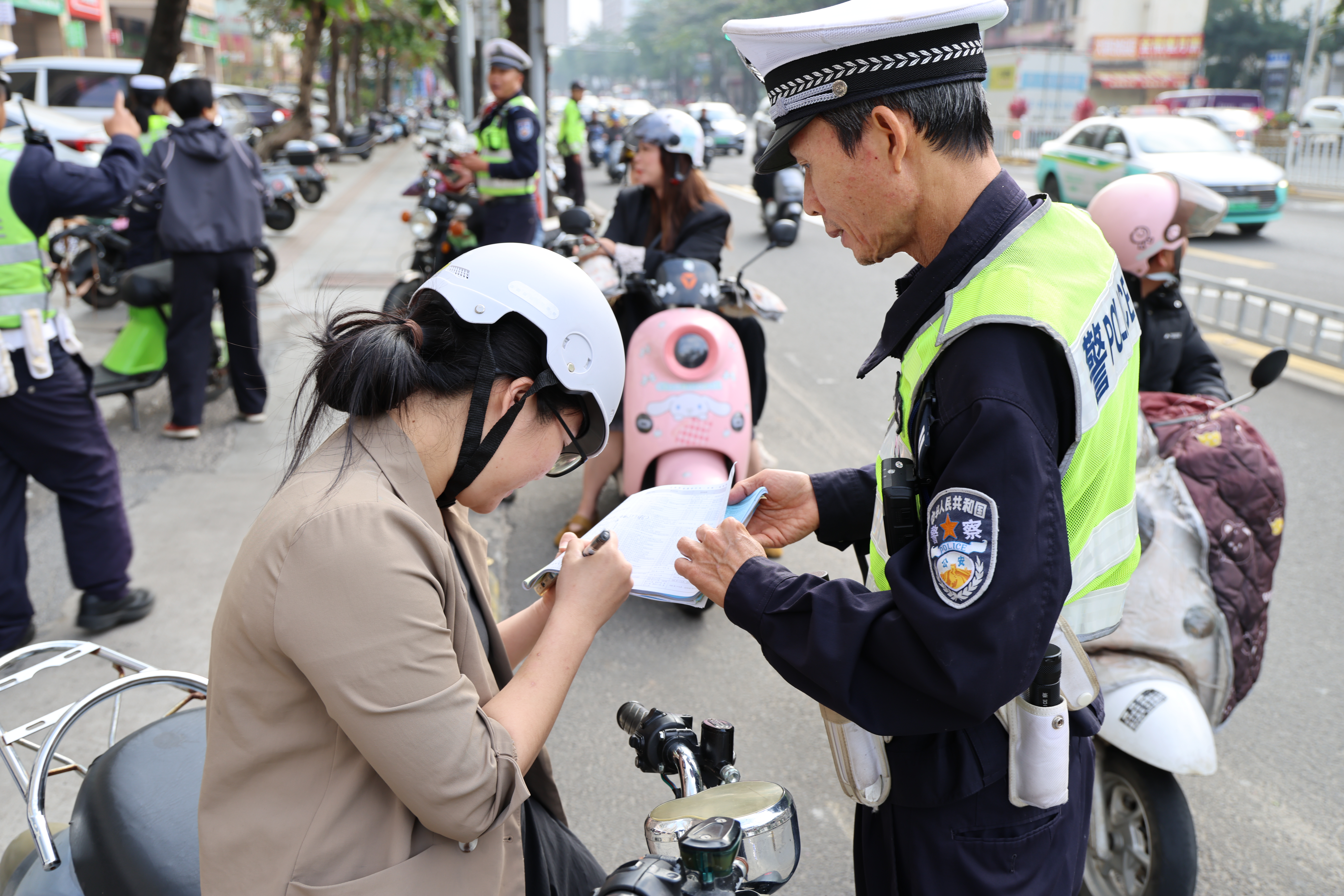执勤民警伍警官在间隙接受了采访,他已经连续工作了3个小时。“今天查处最多的是不戴头盔,其次是逆行、闯红灯、违规载人。”伍警官擦擦额头的汗说,“其实很多市民不是故意违法,而是安全意识不足。整治不是目的,我们希望通过整治+教育的模式,让大家真正认识到危险,从而达到保障人民群众生命安全的目的。”