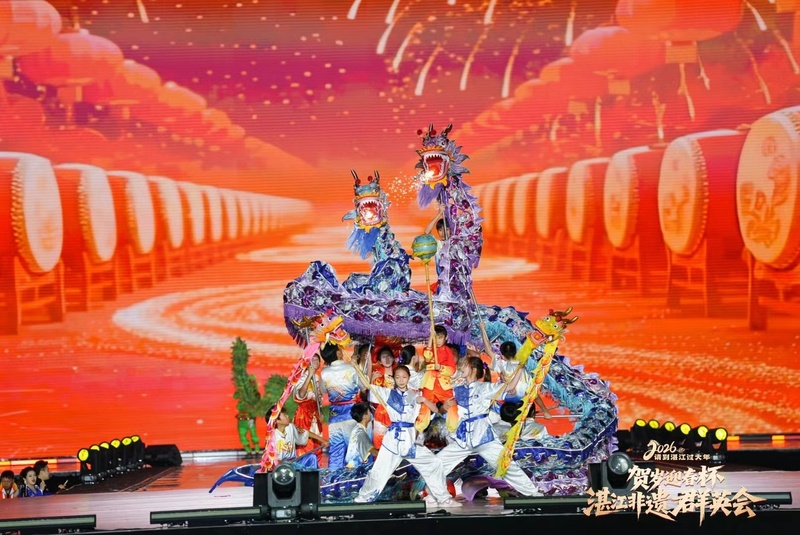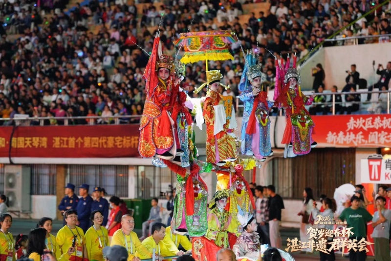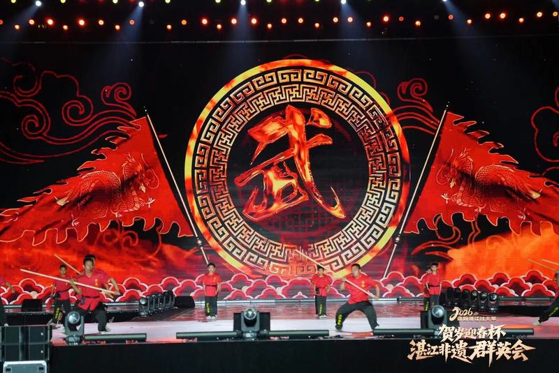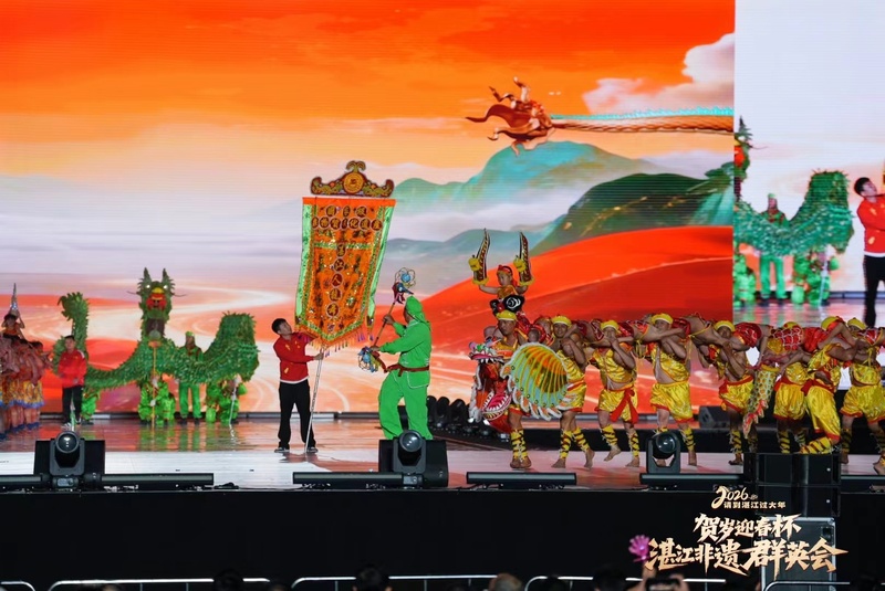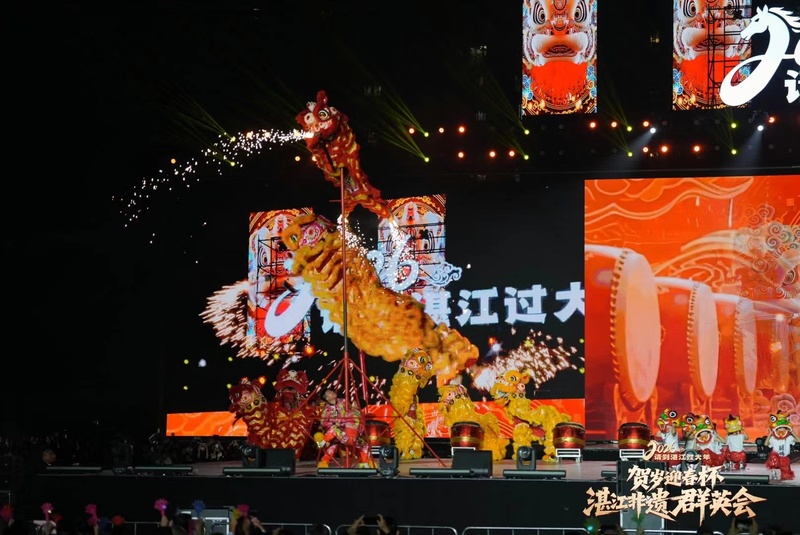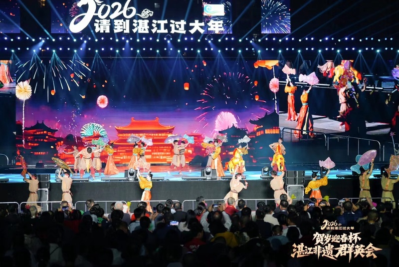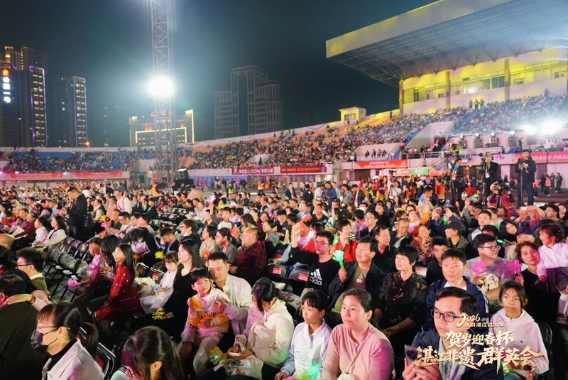 2月20日晚,2026请到湛江过大年“贺岁迎春杯”湛江非遗群英会在湛江市体育中心精彩上演。璀璨灯火与动感鼓乐交相辉映,现代科技与古老非遗交融,近千名演艺人员倾情献艺,为现场近1.5万名市民游客带来一场年味十足、震撼人心的新春文化盛宴,生动书写非遗活态传承的湛江新篇章。