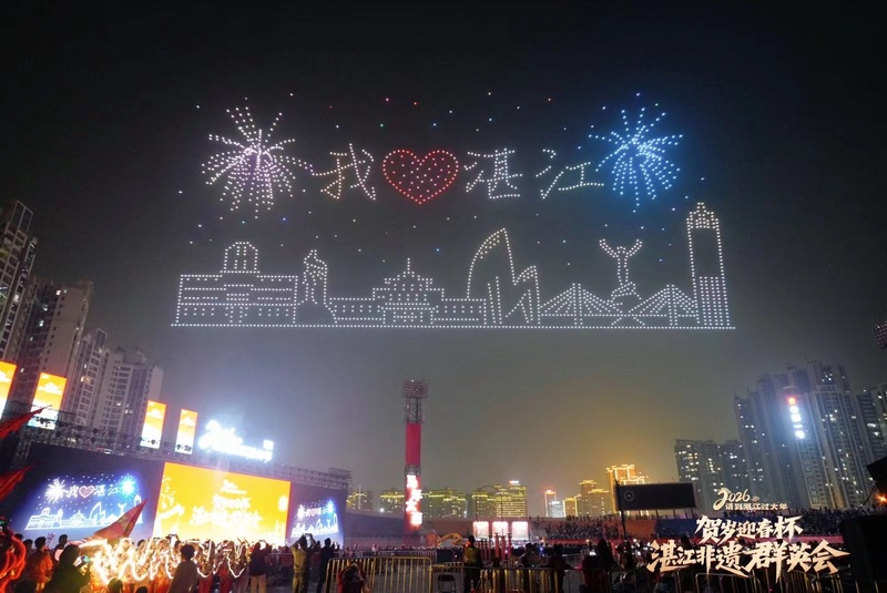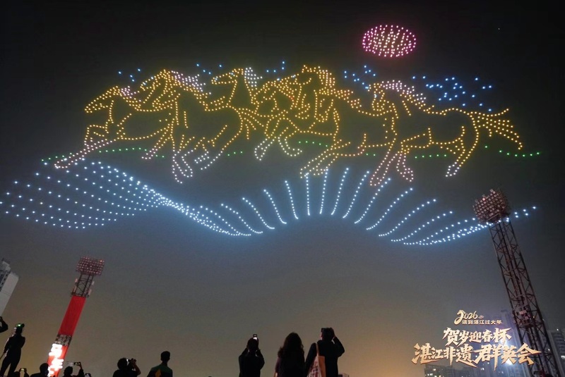 科技赋能让古韵焕新彩,成为本场活动最大亮点。激光全息技术使醒狮等非遗形象跃然眼前,2026架无人机在夜空组成万马奔腾、城市地标、醒狮吐金等绚丽图案,传递新春吉祥祝福。科技与非遗的创新融合,打破了传统传播边界,以年轻化、时尚化的表达方式,让非遗文化更具吸引力与传播力。